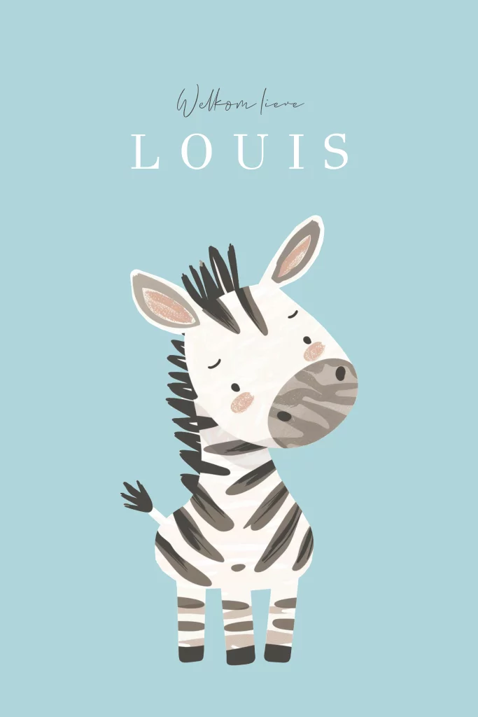 Dit stoere geboortekaartje in blauw met een zebra daar wordt je helemaal vrolijk van. Wat een grappige zebra! Een originele manier om de komst van je zoontje aan te kondigen!