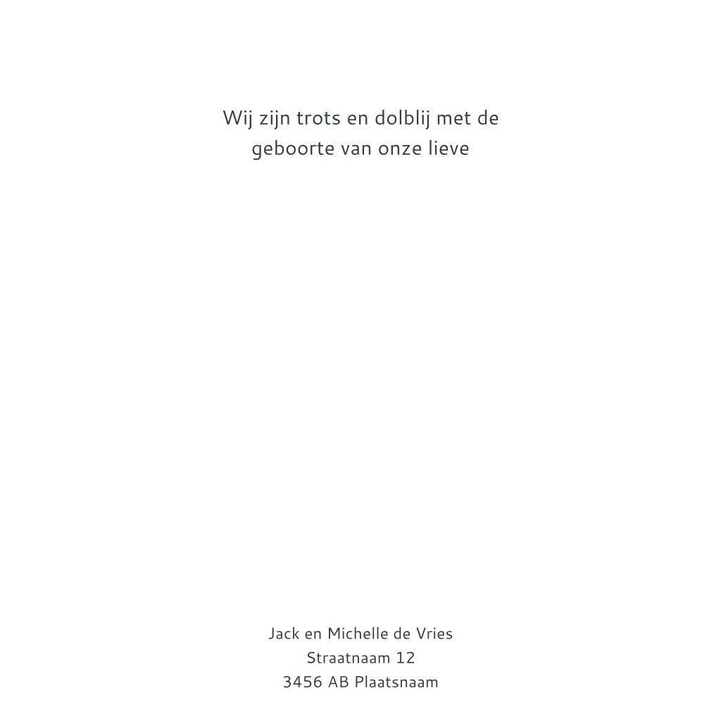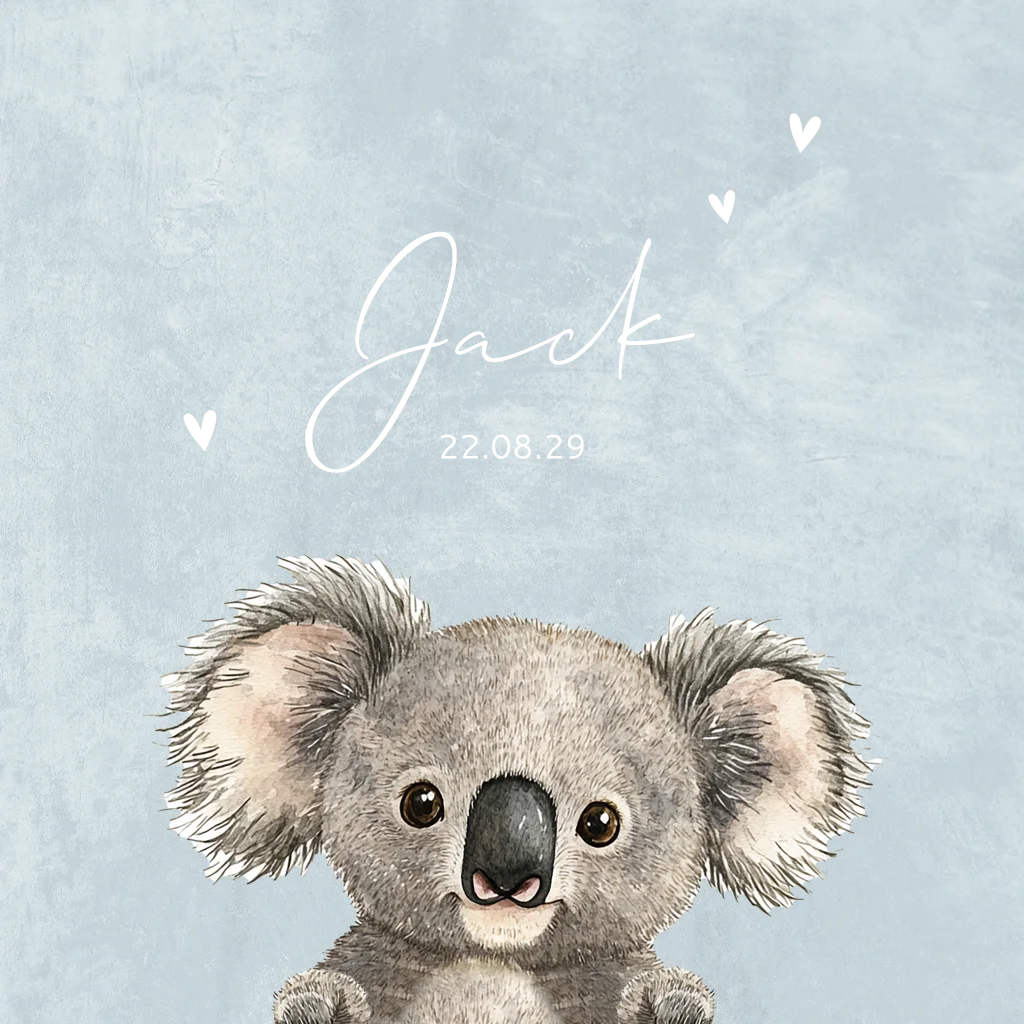 Maak de geboorte van jullie zoon extra bijzonder met dit lieve geboortekaartje koala. De vrolijke koala, afkomstig uit Australië, is geschilderd in aquarel en staat centraal op een zachte blauwe achtergrond met kleine hartjes. De tekst en hartjes zijn met zilverfolie gedrukt. Dit geboortekaartje met koala is superschattig en is eenvoudig te personaliseren met eigen teksten, kleuren en lettertypes in onze editor. Bestel een proefdruk en ervaar zelf hoe dit Australische diertje jullie harten zal veroveren.