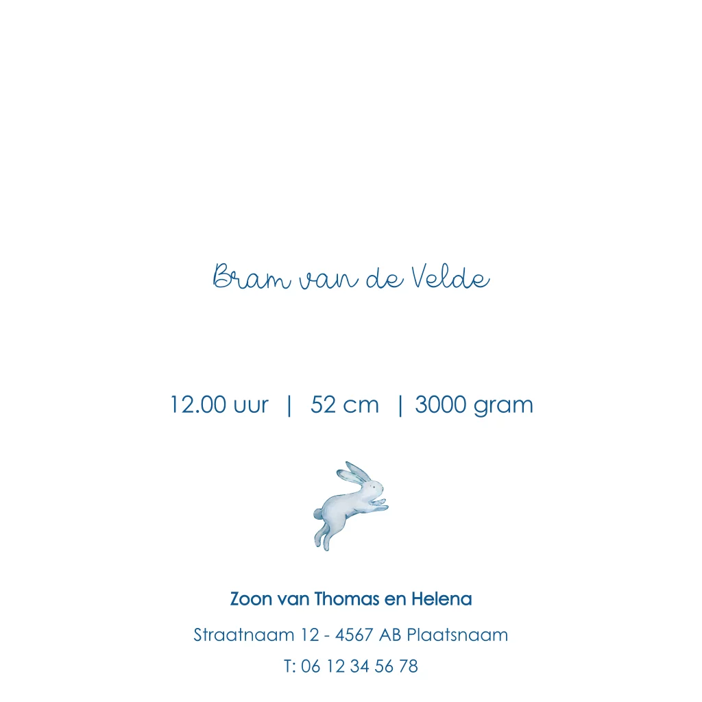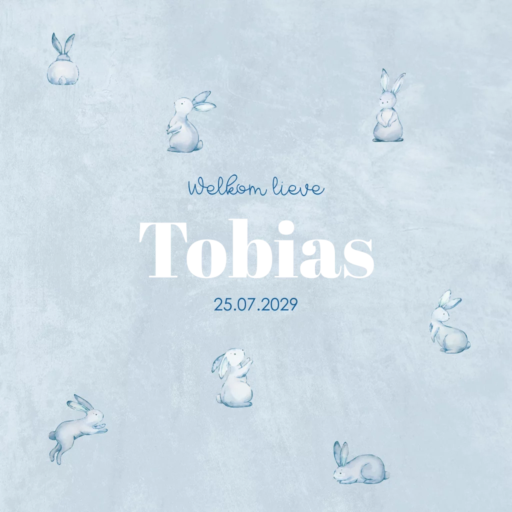 Schattig geboortekaartjes met diverse kleine konijntjes verspreidt over de kaart. Pas het ontwerp aan met de editor en vraag een drukproef aan om een gedrukte versie eerst in het echt te zien.