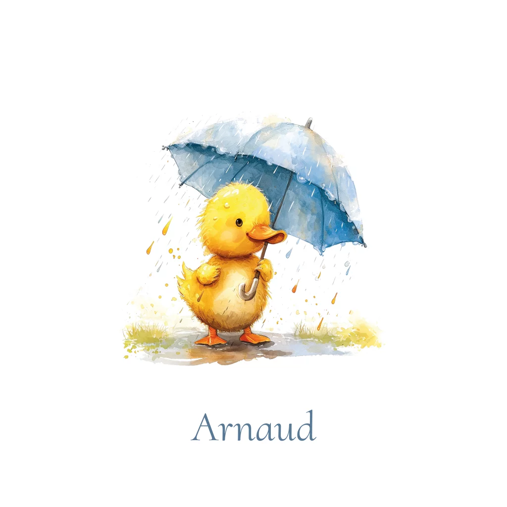 Dit lieve geboortekaartje heeft een vrolijke illustratie van een pluizig geel eendje met een grote paraplu, terwijl de regendruppels om hem heen spatten. De speelse en warme uitstraling maakt dit kaartje perfect voor de geboorte van een jongen (of meisje). De zachte aquarelkleuren en het minimalistische ontwerp zorgen voor een tijdloze look.