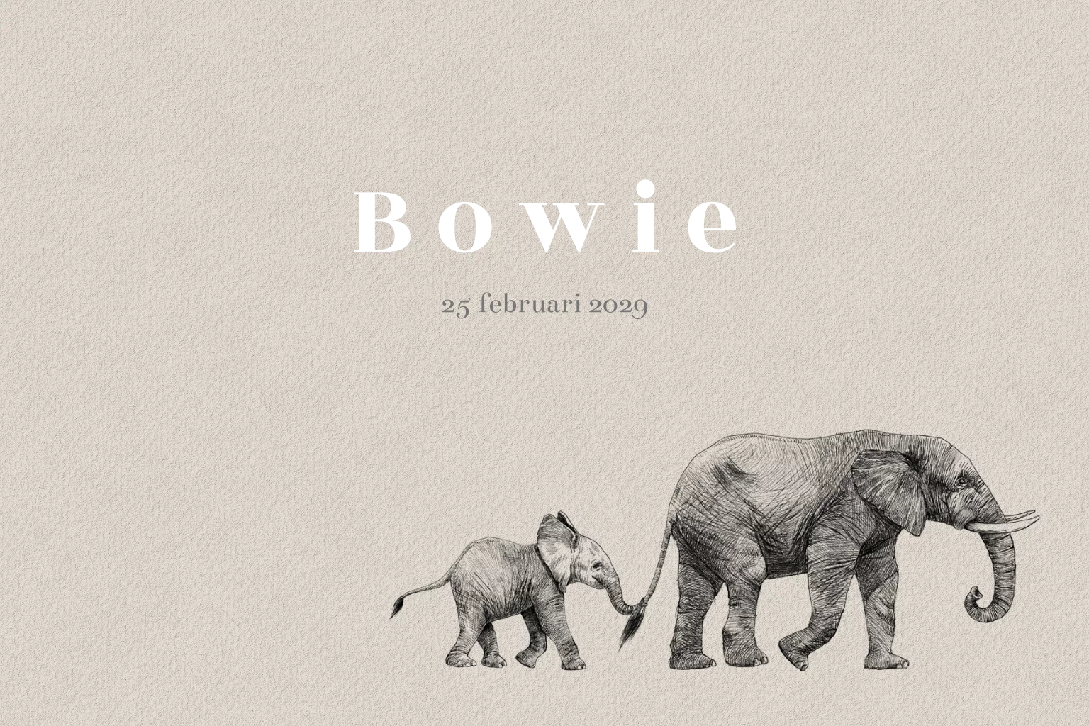 Geboortekaart met twee zwart-wit met pen getekende olifantjes, een grote en een kleine, die elkaars staart vasthouden. De naam van de baby wordt gedrukt in goudfolie, wat een chique, glimmende effect geeft. Onder de naam staat subtiel de geboortedatum. Met onze handige online tool kun je deze kaart eenvoudig bewerken. Vraag een proefdruk aan om de kwaliteit en details van deze bijzondere geboortekaart te zien.
