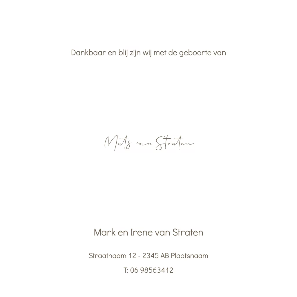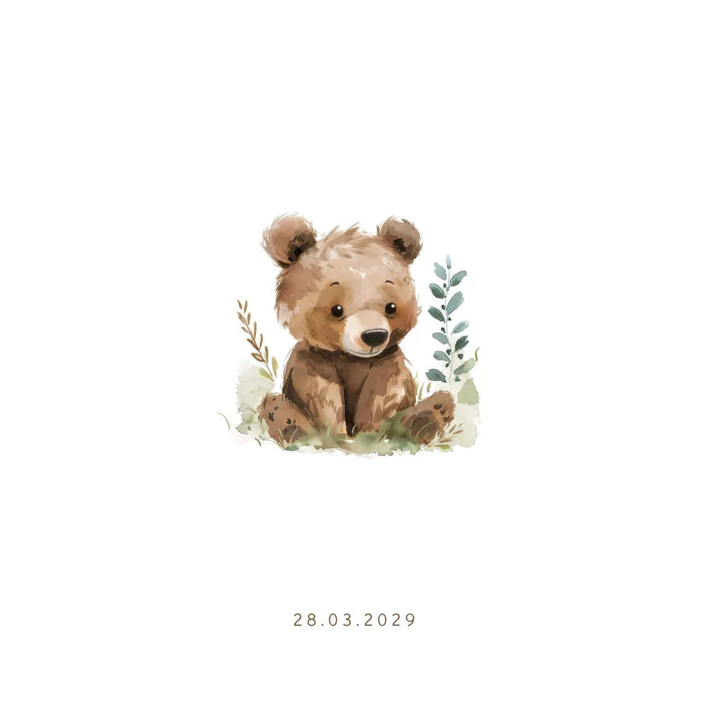 Lief geboortekaartje met een waterverf tekening van een babybeertje zittend in het gras. De naam staat in goudfolie onder het beertje gedrukt. Pas het kaartje eenvoudig aan in onze editor en bestel een proefdruk om het in het echt te bekijken.