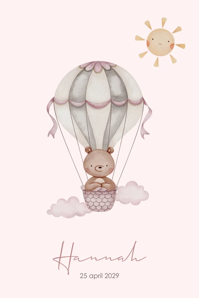 Geboortekaartje met een schattige beer in een luchtballon, omringd door roze wolken en een vrolijk stralende zon. De luchtballon heeft zachte, pastelkleuren met sierlijke linten die meewaaien in de wind. De kleine beer in het mandje kijkt dromerig uit over de wereld, terwijl hij zich veilig nestelt in de warme mand. Pas dit lieve geboortekaartje eenvoudig aan met de editor en bestel een proefdruk.