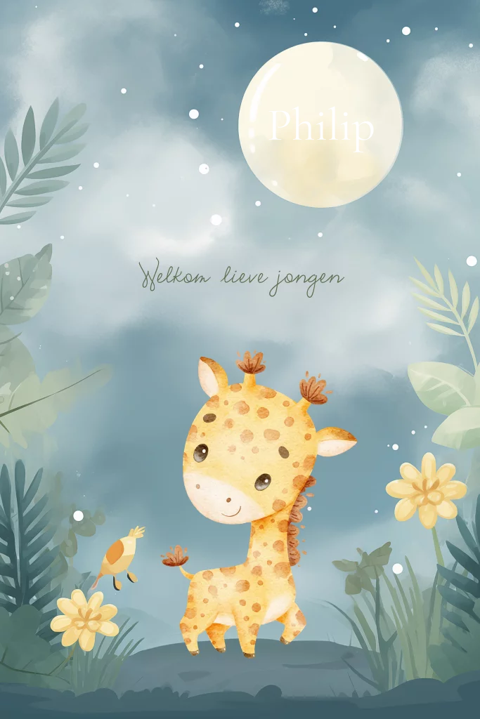 Geboortekaartje met een schattige giraf tussen de bladeren in het zachte avondlicht van de maan. Op de achterkant staan de geboortegegevens. Pas het kaartje helemaal naar wens aan met de handige editor en bestel snel een proefdruk om het eindresultaat te bekijken.