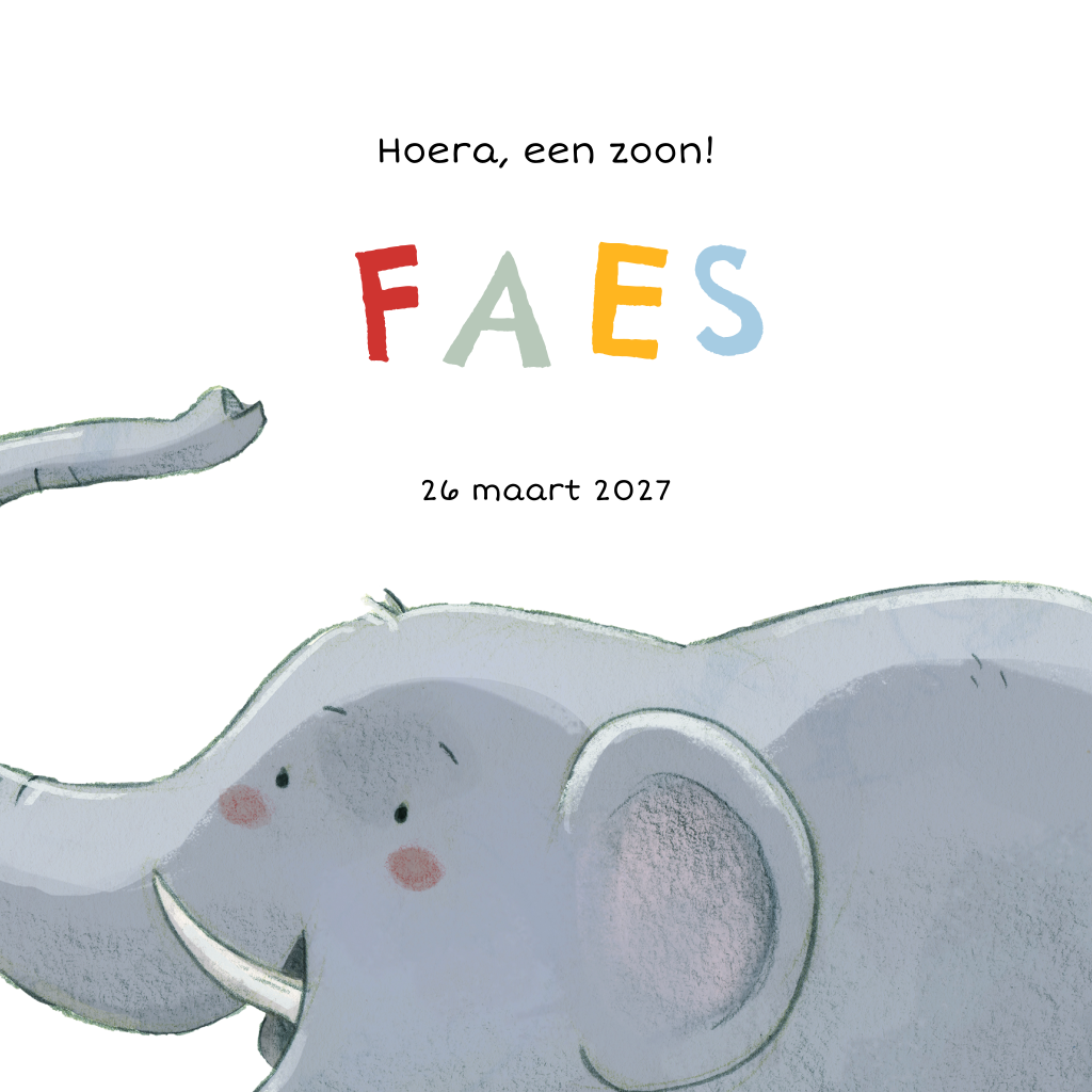 Op zoek naar een vrolijke geboortekaart voor je pasgeboren zoontje? Dit hippe ontwerp heeft een vrolijke illustratie van een olifant op de voorzijde. Uit zijn slurf blaast hij kleurrijke letters die de naam van je zoontje vormen. In de kaart keert de olifant terug en is er ruimte voor een gedichtje en de geboortegegevens. Pas het kaartje naar wens aan en laat een drukproef komen. Zo kun je het resultaat in het echt beoordelen.