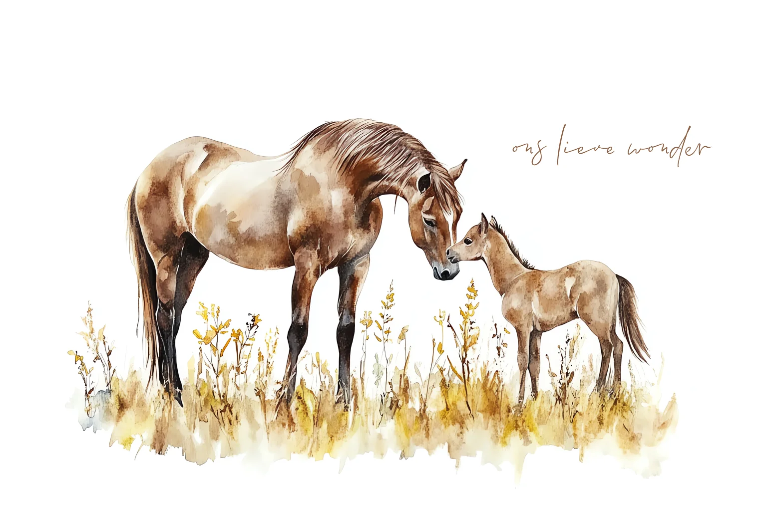 Met waterverf geschilderd geboortekaartje met een merry en haar veulen samen in de wei. Ben jij een paardenliefhebber? Dan is dit geboortekaartje met paarden natuurlijk erg leuk en toepasselijk. Op de achterkant van dit enkele geboortekaartje kun je de geboortegegevens van je kindje plaatsen. Bestel een proefdruk om te zien of dit kaartje in het echt ook in de smaak valt.