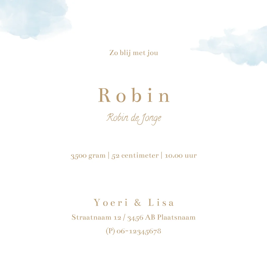 Zijn jullie paardenliefhebbers? Dan is dit geboortekaartje perfect. Een nieuwsgierig veulen staat bij een wiegje op het strand, omringd door wolken, meeuwen en zachte kleuren. Een zomers ontwerp dat rust en natuur uitstraalt. Pas het kaartje eenvoudig zelf aan in onze kaartenmaker en bestel een proefdruk.