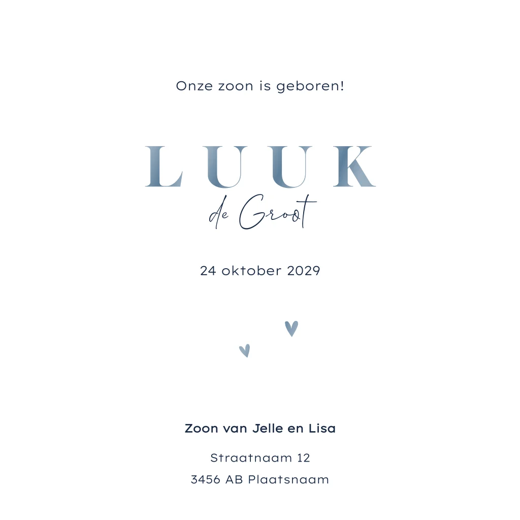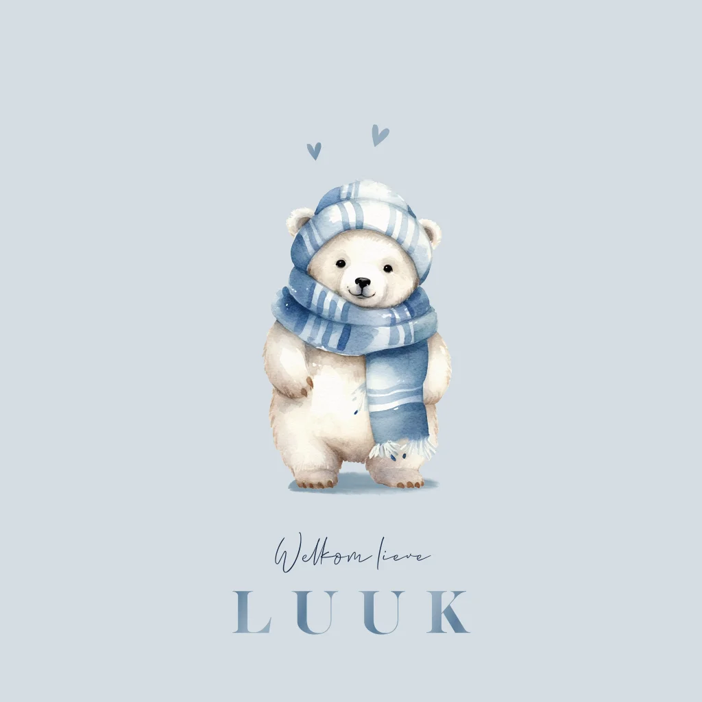Wordt jouw zoontje deze winter geboren? Dit lieve geboortekaartje met ijsbeer met een blauw-wit gestreepte sjaal en muts is superlief. De naam en de hartjes staan in zilverfolie maar kan ook in een andere kleur folie. Pas het kaartje naar wens aan en bestel een proefdruk, dan weet hoe dit kaartje met ijsbeer er in het echt uitziet.