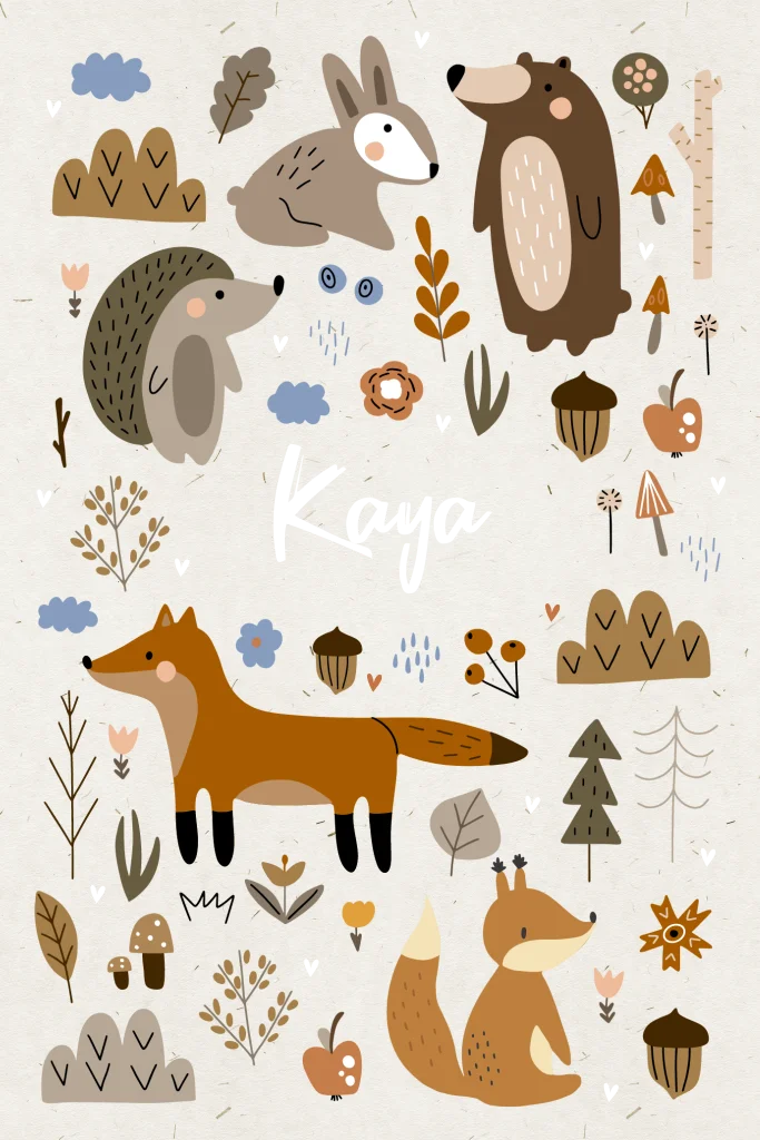 Dit lieflijke geboortekaartje toont een schattige verzameling bosdieren, waaronder een egel, eekhoorn, vos, beer en konijn. De toevoeging van paddestoelen, bladeren en eikels geeft het kaartje een echt herfstachtig karakter. De kleine hartjes en de naam staan in koperfolie. Wil je een proefdruk bestellen? Pas de kaart dan aan met de editor.