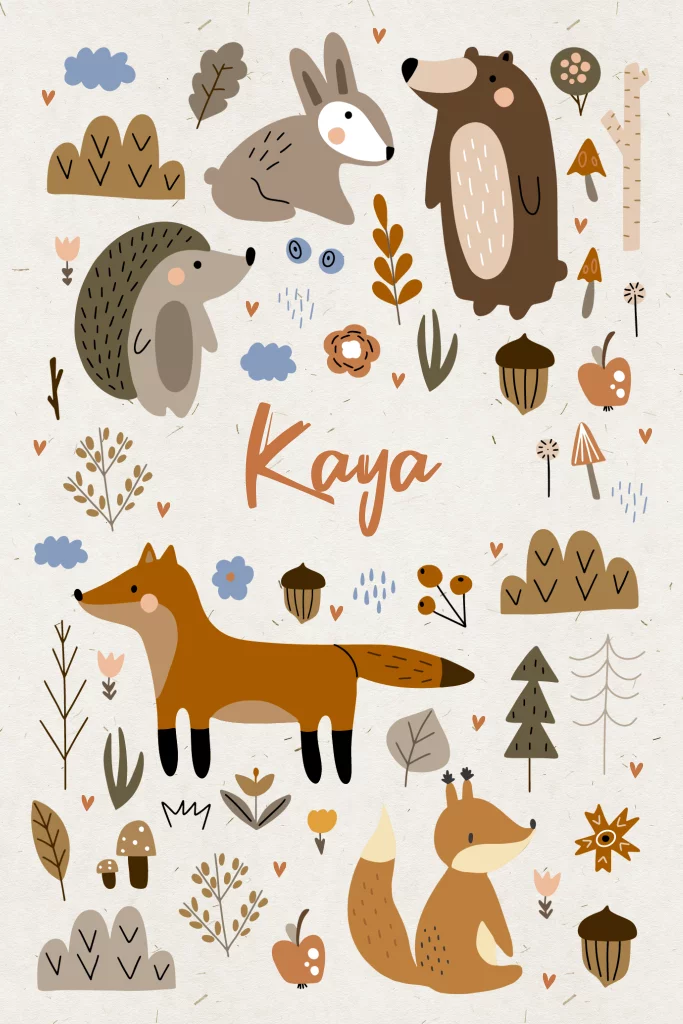 Dit lieflijke geboortekaartje toont een schattige verzameling bosdieren, waaronder een egel, eekhoorn, vos, beer en konijn. De toevoeging van paddestoelen, bladeren en eikels geeft het kaartje een echt herfstachtig karakter. De kleine hartjes en de naam staan in roestbruin. Wil je een proefdruk bestellen? Pas de kaart dan aan met de editor.