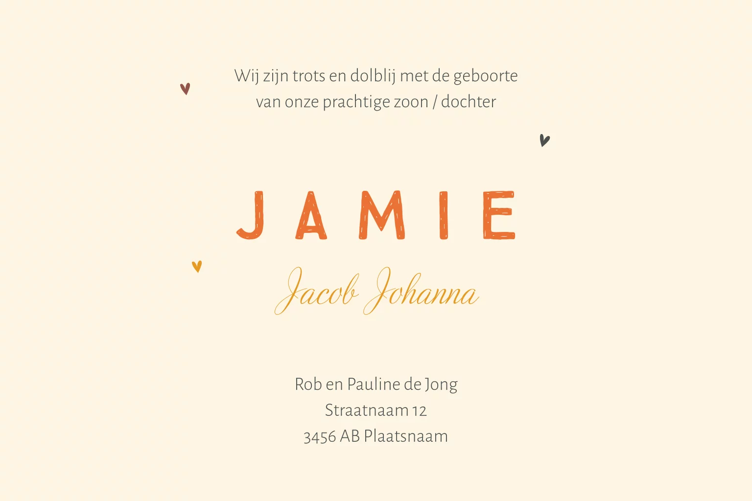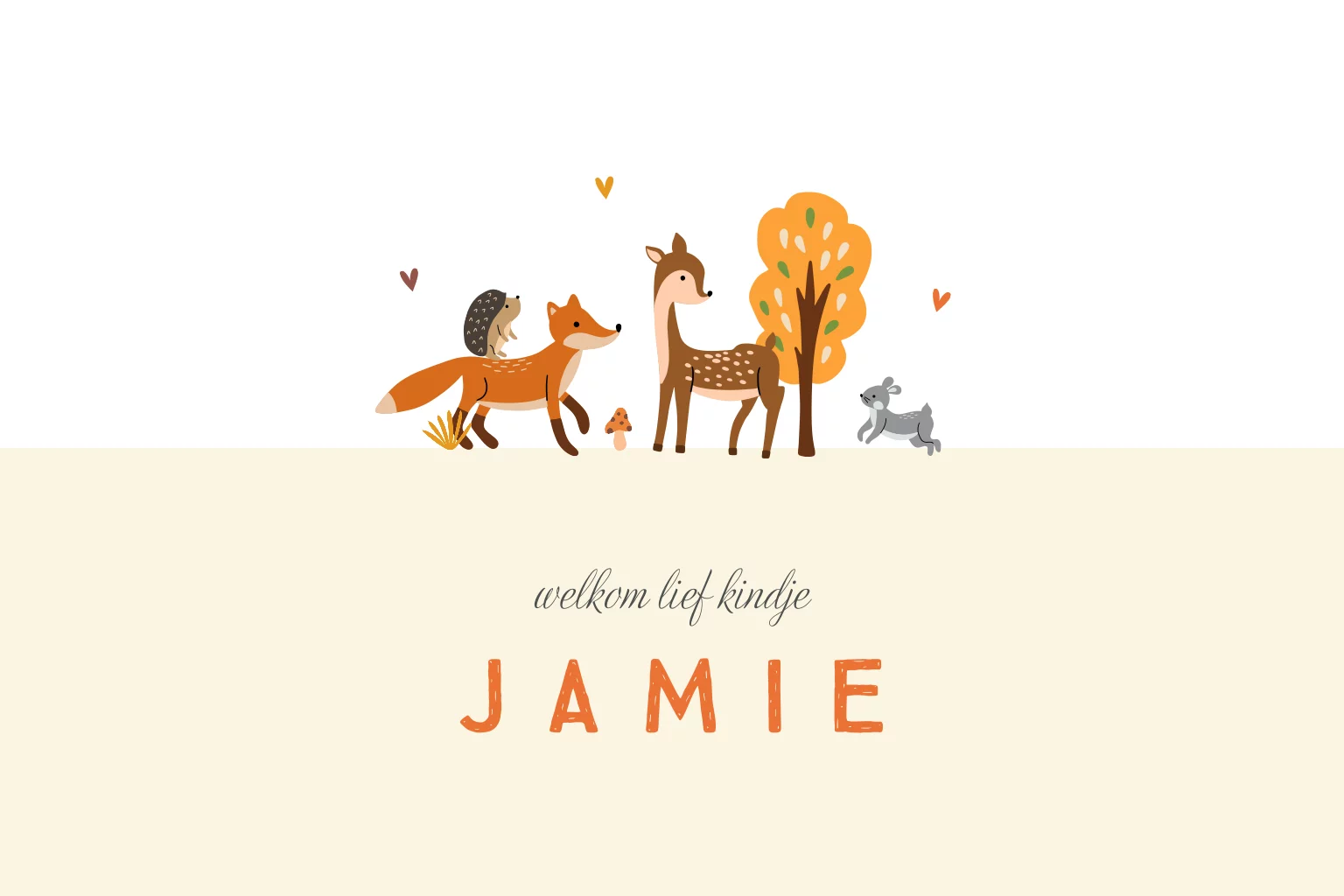Een vrolijk herfst geboortekaartje met kleine bosdieren op een rijtje. Je ziet een vos met egel op z'n rug, een hertje en naast de boom komt een konijn aanrennen. De naam van je kindje komt in oranje, speelse letters onder de diertjes. Je kunt alle onderdelen op deze kaart zelf verschuiven, de lettertypes aanpassen en eventueel afbeeldingen toevoegen. Geef je eigen draai aan dit leuke kaartje en bestel een proefdruk.