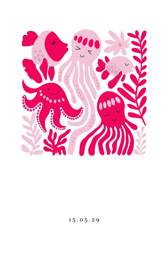 Hip geboortekaartje met een print van diverse zeedieren en planten. Vissen, kwal en inktvisjes, ze zwemmen allemaal even vrolijk rond. De hippe kleuren roze en rood op dit geboortekaartje kun je in de editor naar eigen inzicht aanpassen. De naam op de voorzijde staat in goudfolie.