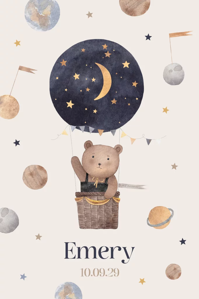 Jongenskaart met beertje in luchtballon, sterren en planeten