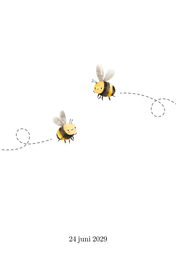 Een lichte geboortekaart met een frisse uitstraling. Twee schattige bijtjes stelen de show en kijken verliefd naar elkaar – een subtiele knipoog naar nieuw leven in de lente. De namen van jullie zoon of dochter schitteren in goudfolie, wat zorgt voor een sprankelend accent. Dankzij de minimalistische stijl en zachte kleuren is dit kaartje perfect voor een vrolijk lentebaby’tje.