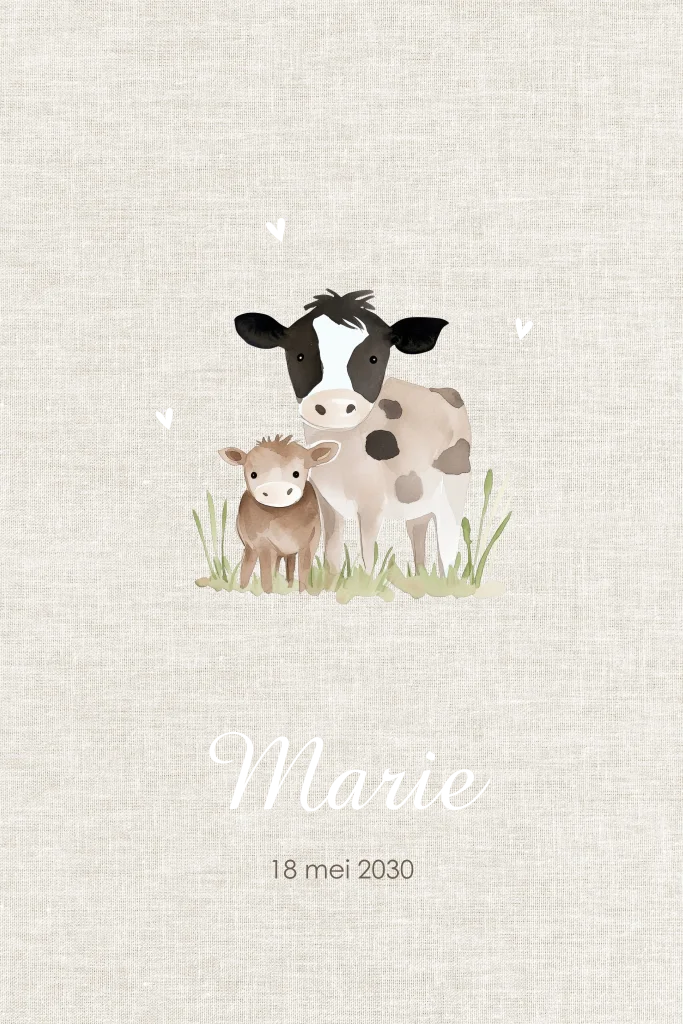 Dit geboortekaartje heeft een linnenlook achtergrond. In het midden staat een koe met haar kalf in het gras. De naam en hartjes zijn gedrukt in mat goudfolie, wat mooi opvalt op de lichte basis. De datum staat eronder in een eenvoudig lettertype. Pas het kaartje aan in de editor en bestel een proefdruk.