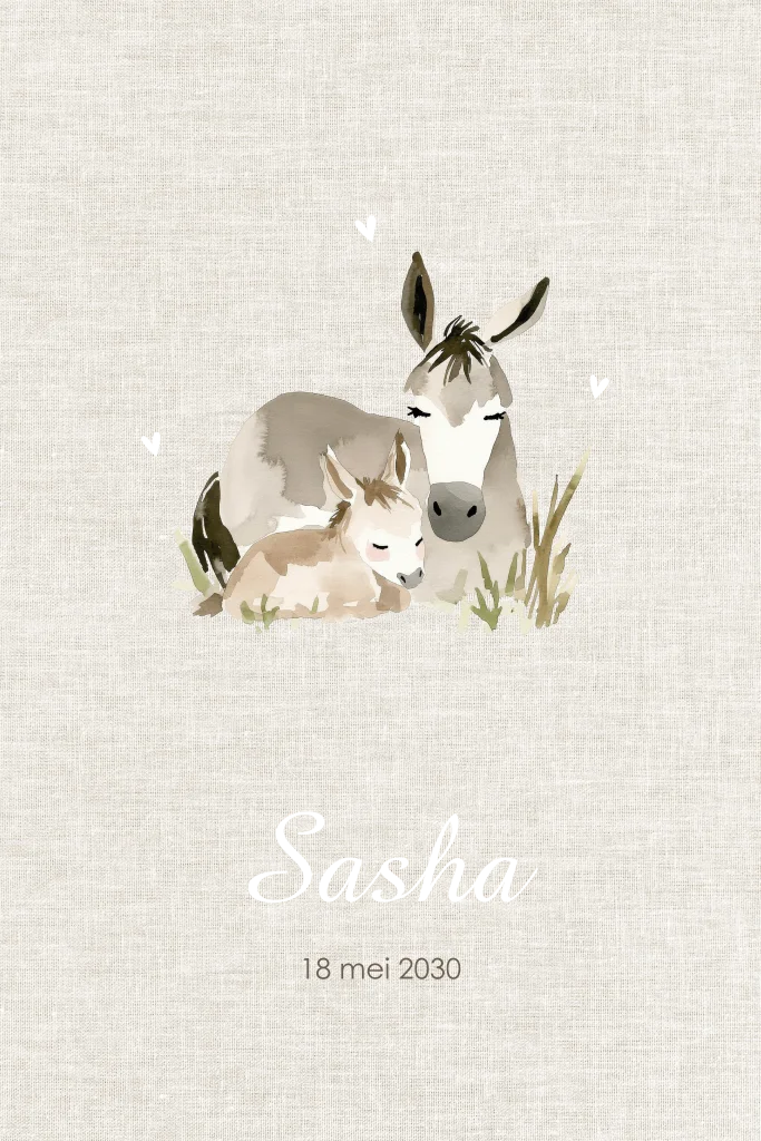 Dit geboortekaartje heeft een natuurlijke linnenstructuur als achtergrond. In het midden staat een illustratie van een moeder ezel met haar veulen, dicht tegen elkaar aan liggend. De hartjes en de naam zijn gedrukt met mat goudfolie en past goed bij de kleuren van de ezeltjes. Pas eenvoudig aan in de editor en bestel een drukproef.