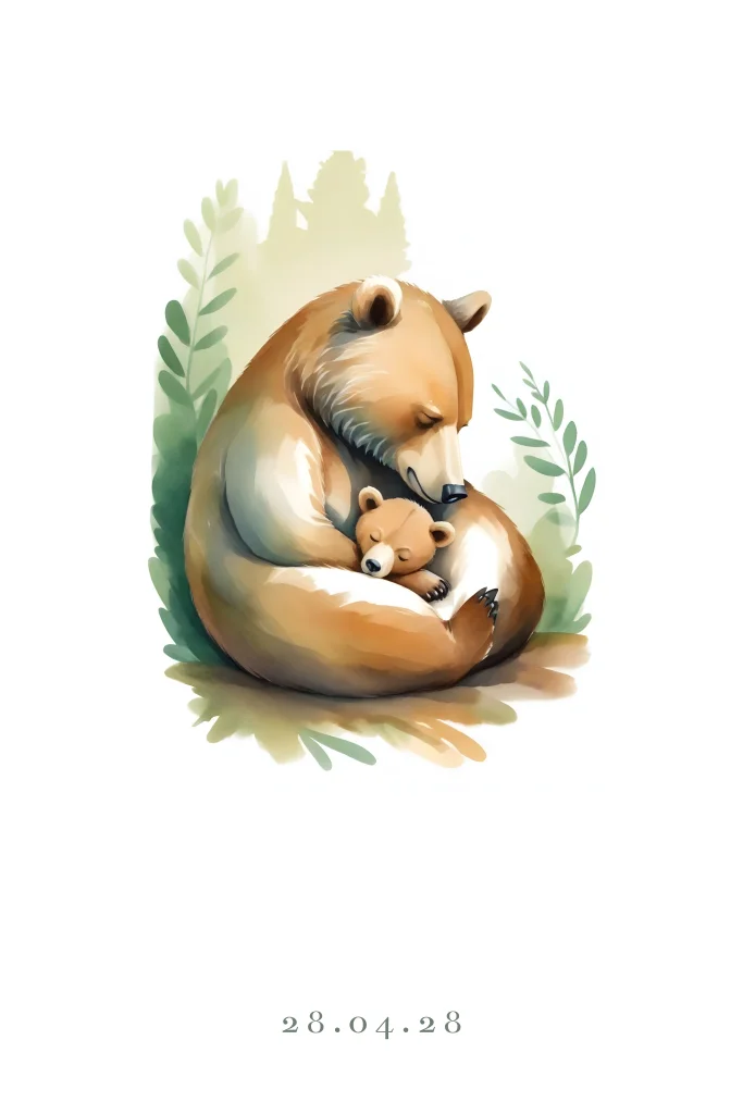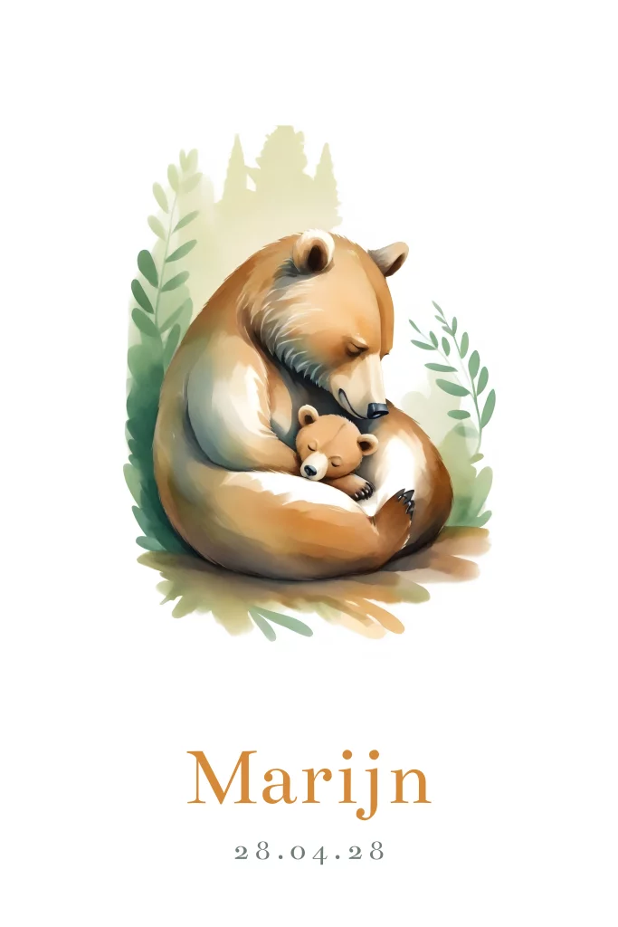 Lief geboortekaartje met een lieve moederbeer die haar babybeertje in haar armen houdt. Pas deze schattige kaart aan met onze editor en bestel een drukproef voor de perfecte finishing touch.