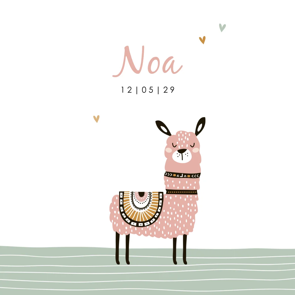 Op zoek naar een geboortekaartje met een speels en stijlvol dierenthema? Deze lieve roze lama met boho dekje en zachte hartjes is perfect voor de geboorte van jullie dochter. De illustratie straalt rust, warmte en een vleugje bohemian uit. Een origineel kaartje dat meteen opvalt.