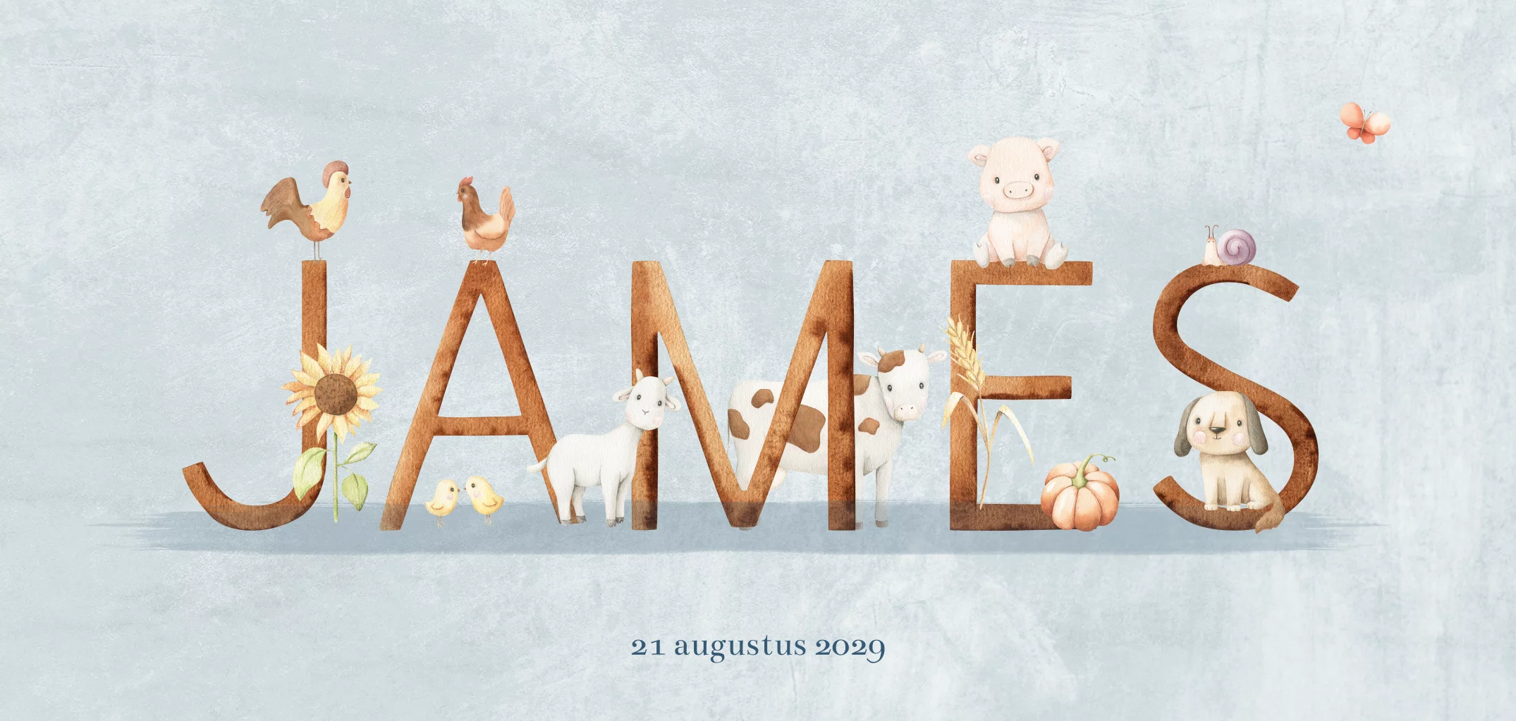 Betreed onze boerderijwereld met het geboortekaartje van je zoontje, waar zijn naam schittert in grote bruine waterverf letters, omringd door schattige boerderijdieren. Voorop staat een geit, kippen, koe, varken en haan, achterop een tractor en molen en nog meer leuke diertjes. Pas de naam en de diertjes gemakkelijk aan met onze editor. Je kunt de letters terugvinden "Afbeeldingen" en dan "Cijfers en letters". Bestel een drukproef om dit geboortekaartje. in het echt te zien.