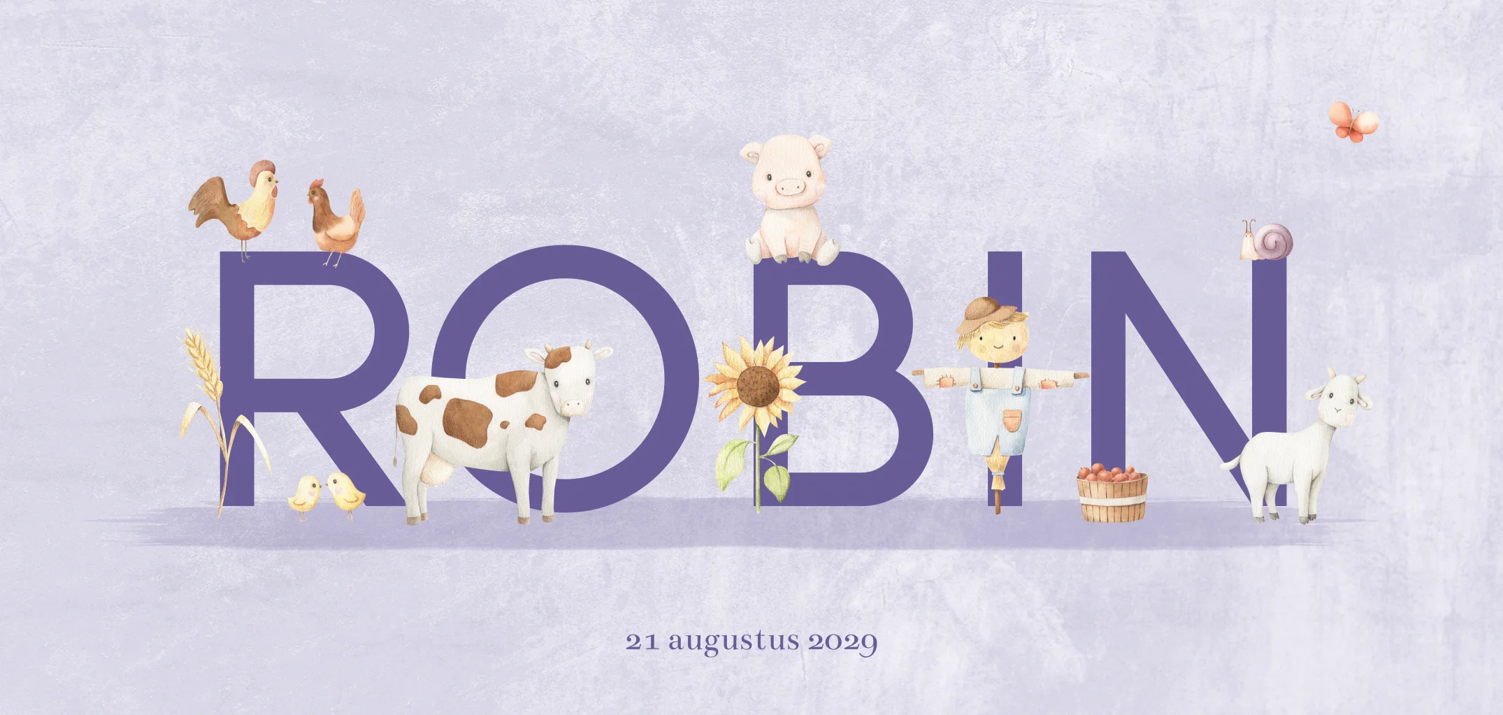 Welkom op onze boerderij! Ontdek het schattige geboortekaartje voor jouw kleine meisje. Haar naam pronkt in paarse letters, omringd door vriendelijke boerderijdieren. Voorop staat een koe, kippen, geit, varken en een vogelverschrikker, achterop een tractor en molen en nog meer leuke diertjes. Pas gemakkelijk de naam en dieren aan met de illustraties in onze handige editor. En voor een voorproefje in het echt, bestel een drukproef van het kaartje.