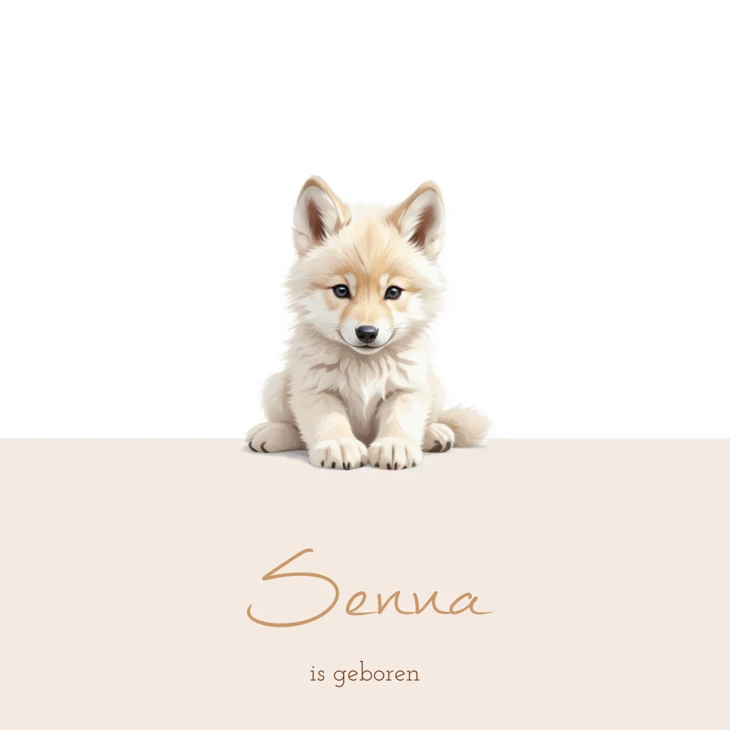 Superlief geboortekaartje met een baby wolfje dat je recht van voren aankijkt. Wat een schatje! Mooi neutraal ontwerp voor de geboorte van een zoon of dochter. Pas de teksten en kleuren aan als je net iets anders in gedachte hebt. Klaar? Bestel een drukproef om dit kaartje eerst nog even in het echt te zien.