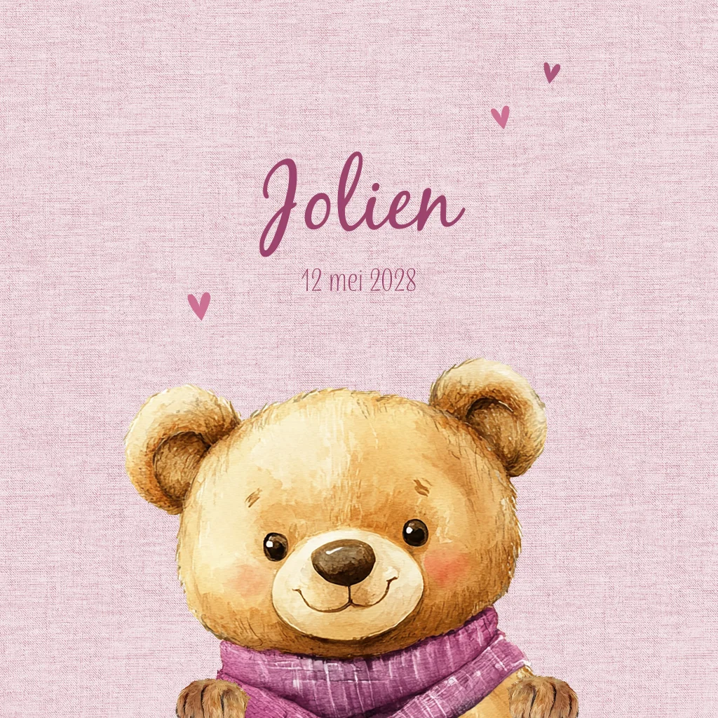 Lief geboortekaartje met beer in roze tinten, speciaal voor de geboorte van een meisje. De achtergrond heeft een roze linnenlook wat mooi past bij de bruine teddybeer. Dit geboortekaartje met beer meisje is eenvoudig te personaliseren met naam, datum en tekst in onze online editor.