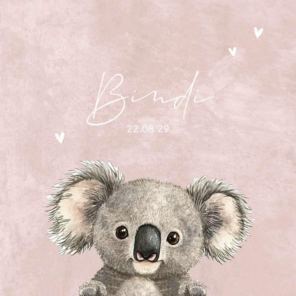 Kondig de geboorte van jullie dochter aan met dit schattige roze geboortekaartje met een koala. Het lieve koalabeertje met zijn zachte vacht en grote oren is geïllustreerd in aquarelstijl. De subtiele roze achtergrond en kleine roségoudfolie hartjes bij dit geboortekaartje met koala passen perfect bij een meisje. Personaliseer eenvoudig de naam, kleuren en teksten in onze online editor en bestel een proefdruk om het kaartje in het echt te bewonderen.