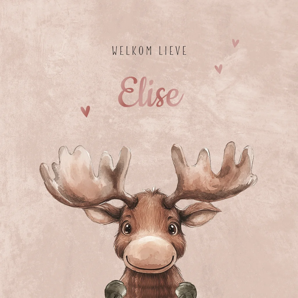 Vier de komst van jullie dochter met dit schattige geboortekaartje met baby hert. Het lieve getekende hertje met groot gewei staat centraal op een zachte roze achtergrond, versierd met donkerroze hartjes. De hoogglans afwerking geeft het kaartje een luxe uitstraling, waardoor het extra bijzonder wordt om te versturen. Dit meisjes geboortekaartje met hert is eenvoudig aan te passen in onze editor met eigen teksten, kleuren en lettertypes.