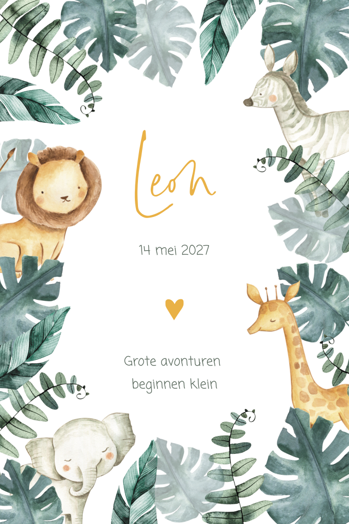 Is de babykamer van jouw kleintje helemaal in safari stijl? Kies dan voor dit bijpassende geboortekaartje. De voorzijde is omrand met grote tropische bladeren. Tussen de bladeren vang je en glimp op van een leeuw, een giraf, een zebra en een olifant. Op de achterzijde is ruimte voor de geboorte- en adresgegevens. Bestel een drukproef en bekijk het kaartje in het echt.