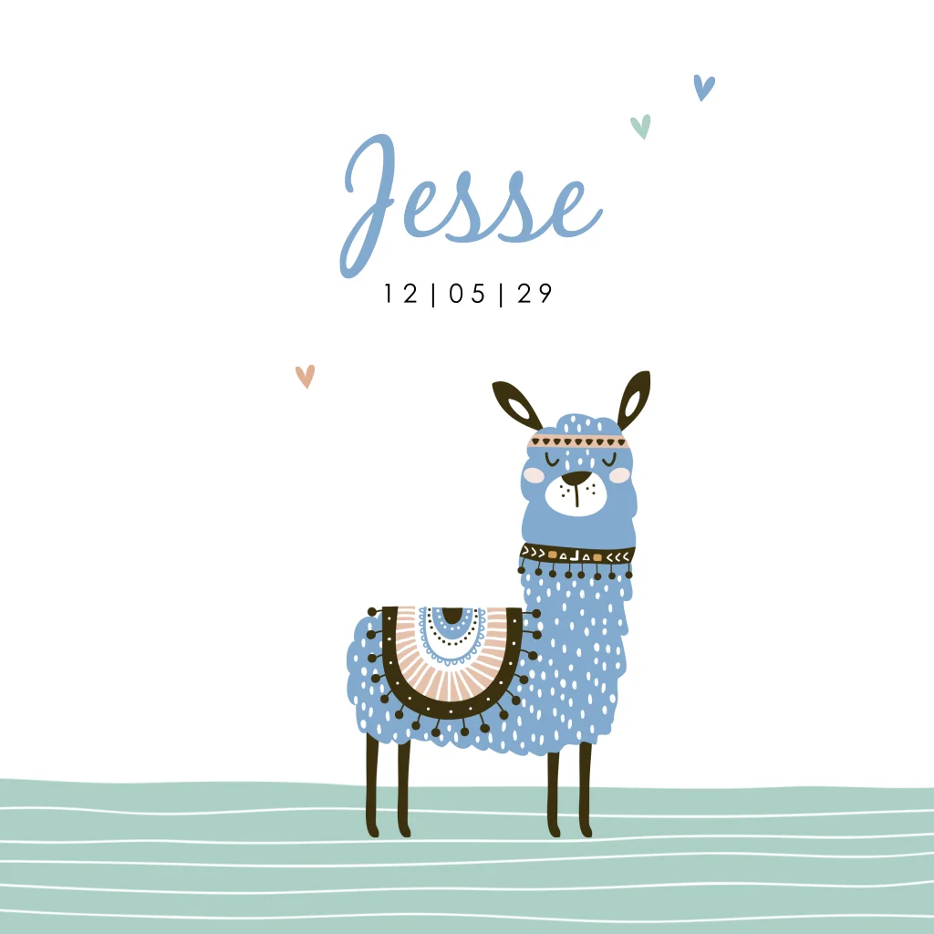 Welkom op de wereld, kleine avonturier! Dit geboortekaartje met een blauwe lama is speels en uniek. De lama is versierd met een kleurrijk dekje en etnisch patroon, perfect voor ouders die op zoek zijn naar een geboortekaartje met een werelds en origineel tintje. De zachte kleuren en lieve hartjes maken het helemaal af.