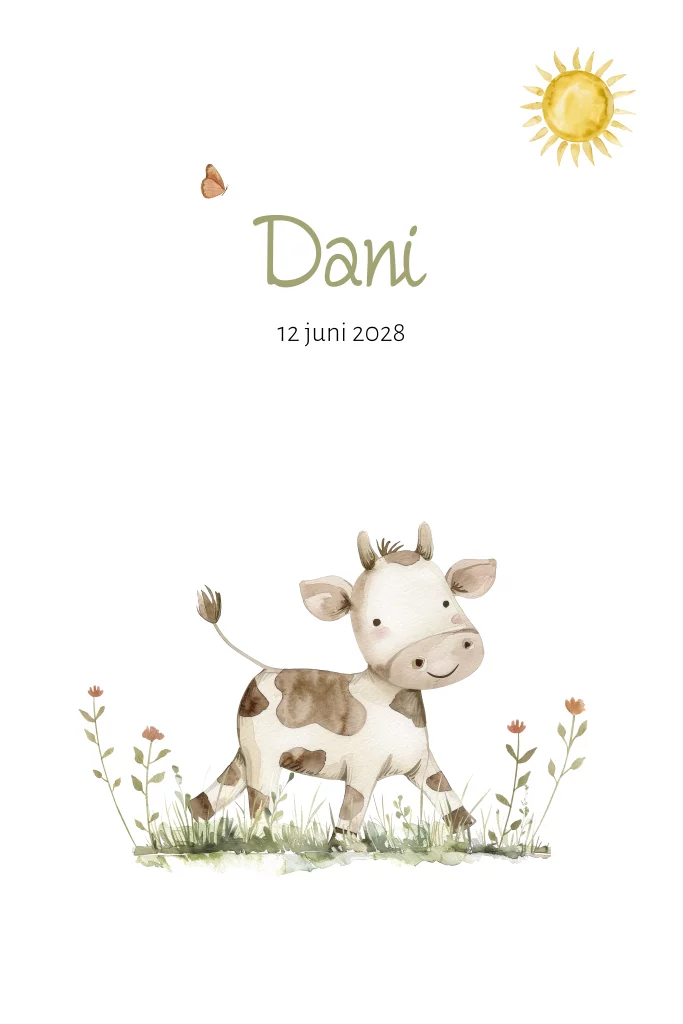 Een lief en vrolijk geboortekaartje met een speelse koe in aquarelstijl, omringd door bloemen en gras. De zon en vlinder maken het ontwerp extra zomers en fris. Perfect voor een landelijke geboorteaankondiging met een knipoog naar het boerenleven. Pas eenvoudig de naam, datum en tekst aan in onze online editor en bestel een proefdruk.