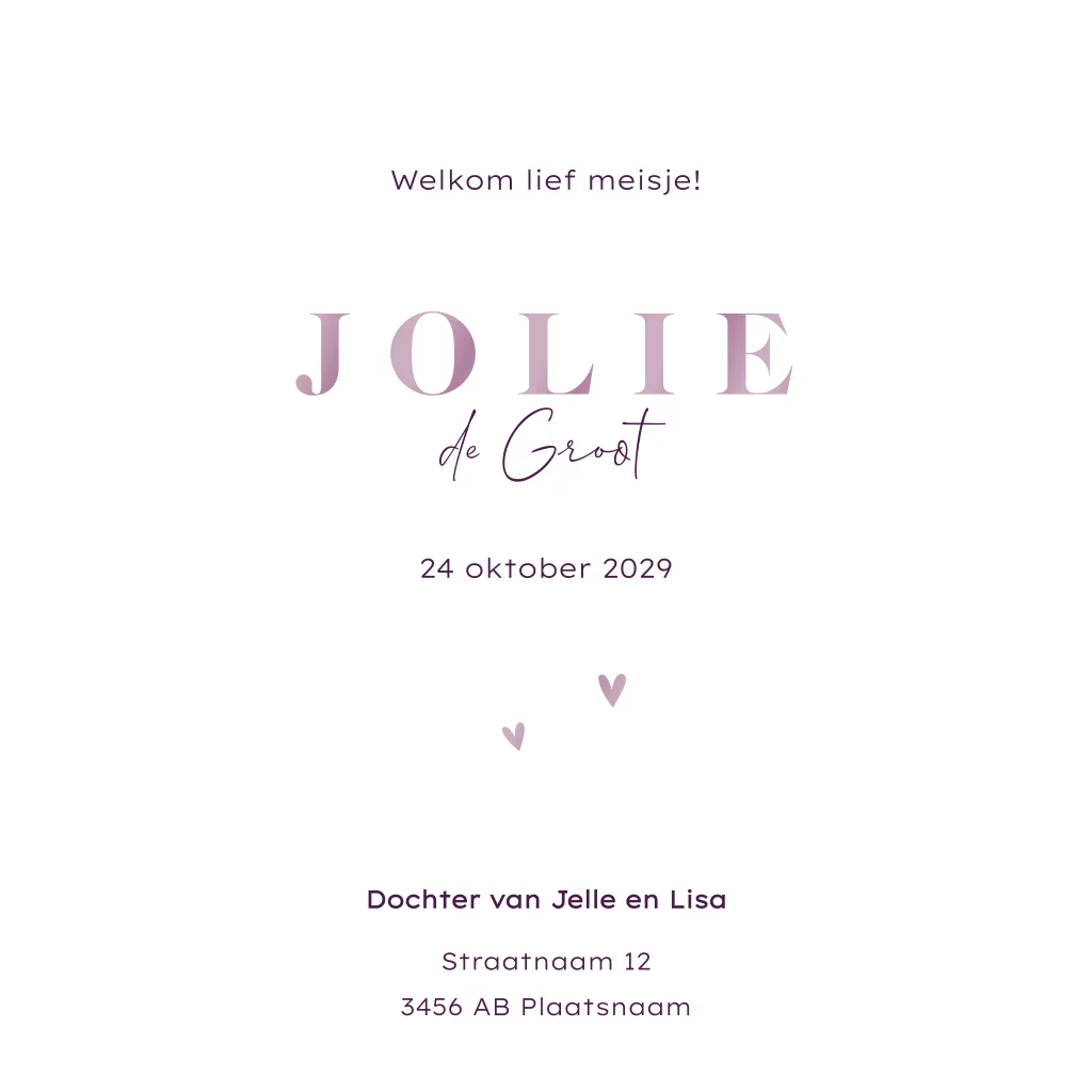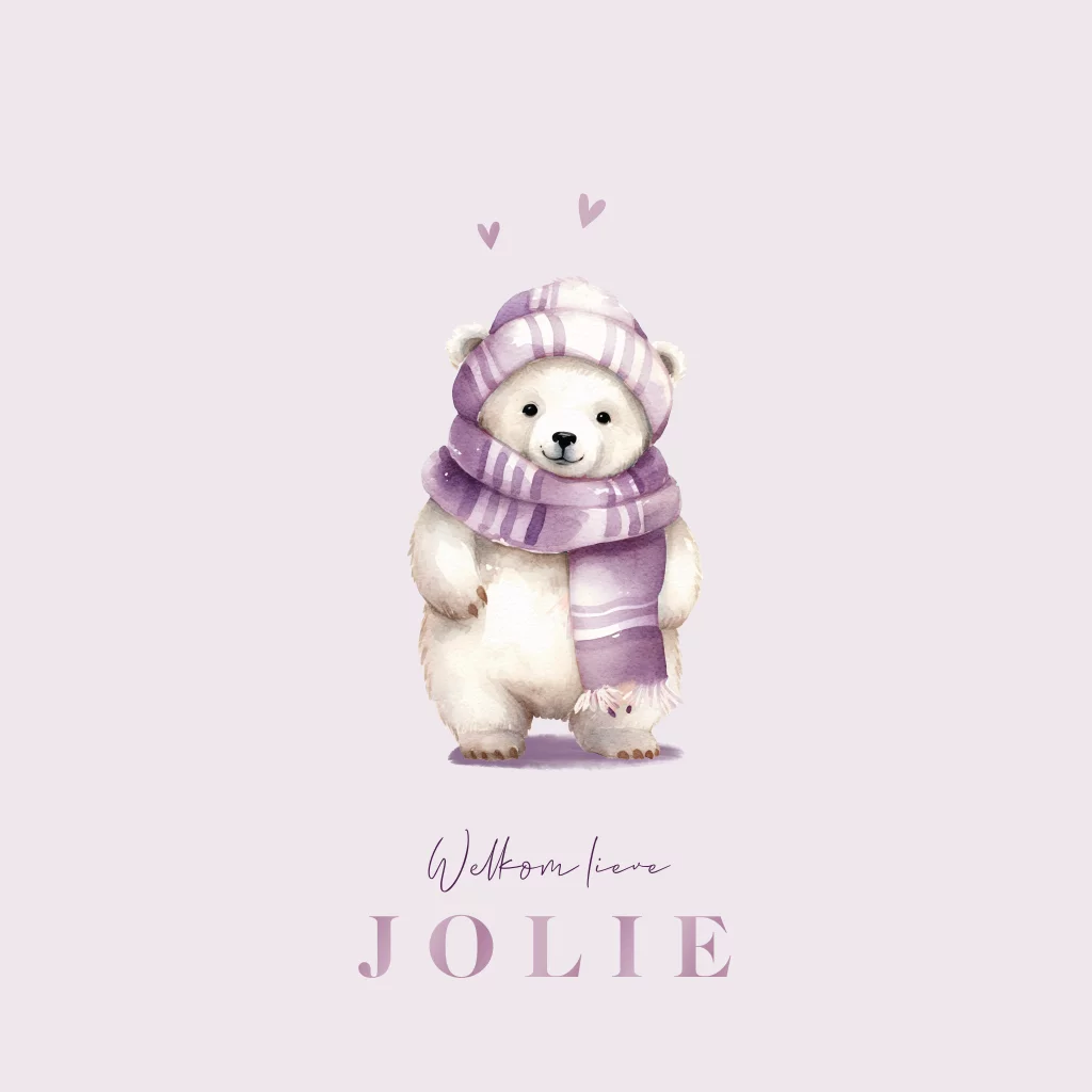Wordt jouw dochter deze winter geboren? Dit lieve geboortekaartje met ijsbeer met een paars-wit gestreepte sjaal en muts is superlief. De naam en de hartjes staan in hoogglans maar kan ook in een andere kleur folie. Pas het kaartje naar wens aan en bestel een proefdruk, dan weet hoe dit kaartje met ijsbeer er in het echt uitziet.