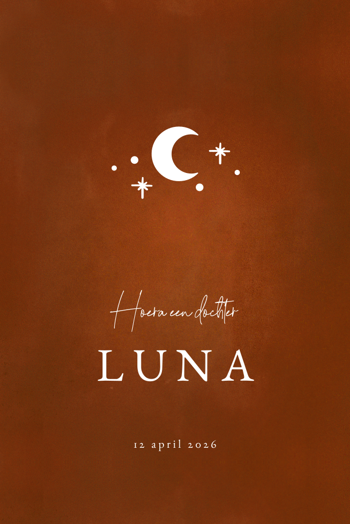 Roestrood geboortekaartje maantje en sterretjes met goudfolie. Enkel geboortekaartje met de populaire kleur roestrood. In combinatie met de goudfolie naam en het maantje krijgt het kaartje een extra stijlvolle uitstraling. Op de achterzijde keert het maantje in goudfolie terug en kun je alle geboortegegevens plaatsen. Pas de kleuren en lettertypes naar wens aan en bestel een drukproef om de glans op het meisjes kaartje in het echt te bekijken.