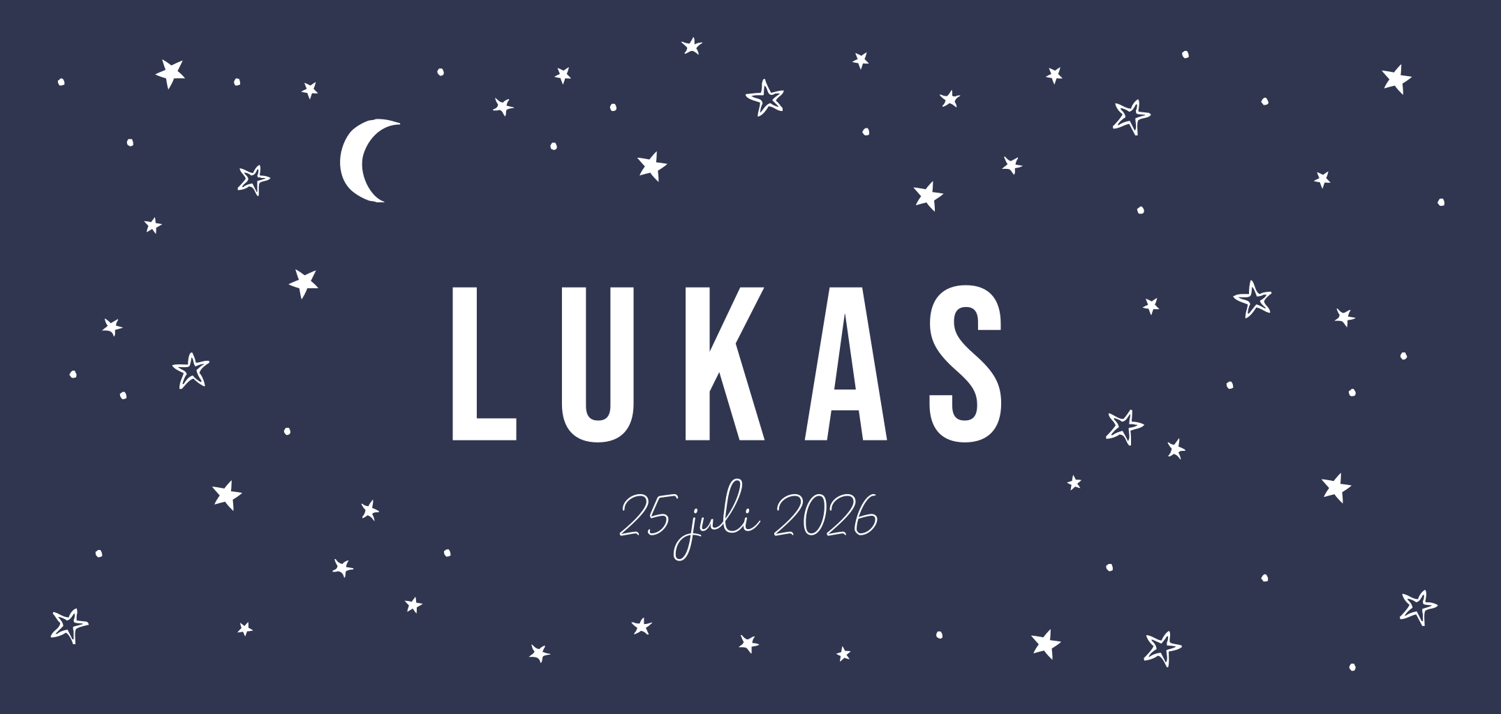 Blauw geboortekaartje met maan, sterren en naam in goudfolie. Dit langwerpige geboortekaartje heeft een donkerblauwe achtergrond. De voorzijde van de kaart heeft een illustratie van een sterrenhemel. Sommige sterren worden gedrukt met goudfolie, zodat ze echt gaan stralen. De naam staat met een stoer lettertype voorop de kaart en kan ook met goudfolie gedrukt worden. Op de achterzijde keren de sterren terug en is er ruimte voor een foto in het witte kader.