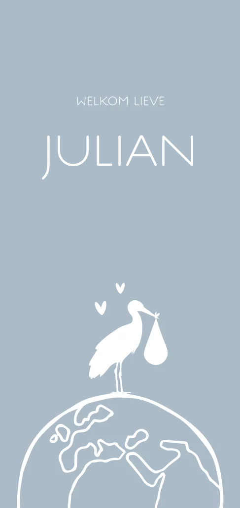 Leuk, enkel geboortekaartje met een blauwe achtergrond en een silhouet van een ooievaar met een baby jongen op een grote wereldbol. Op de voorzijde staat de naam in zilverfolie waardoor deze extra opvalt. Ook de twee hartjes bij de ooievaar staan in zilverfolie. Pas de kaart naar wens aan en bestel een drukproef.