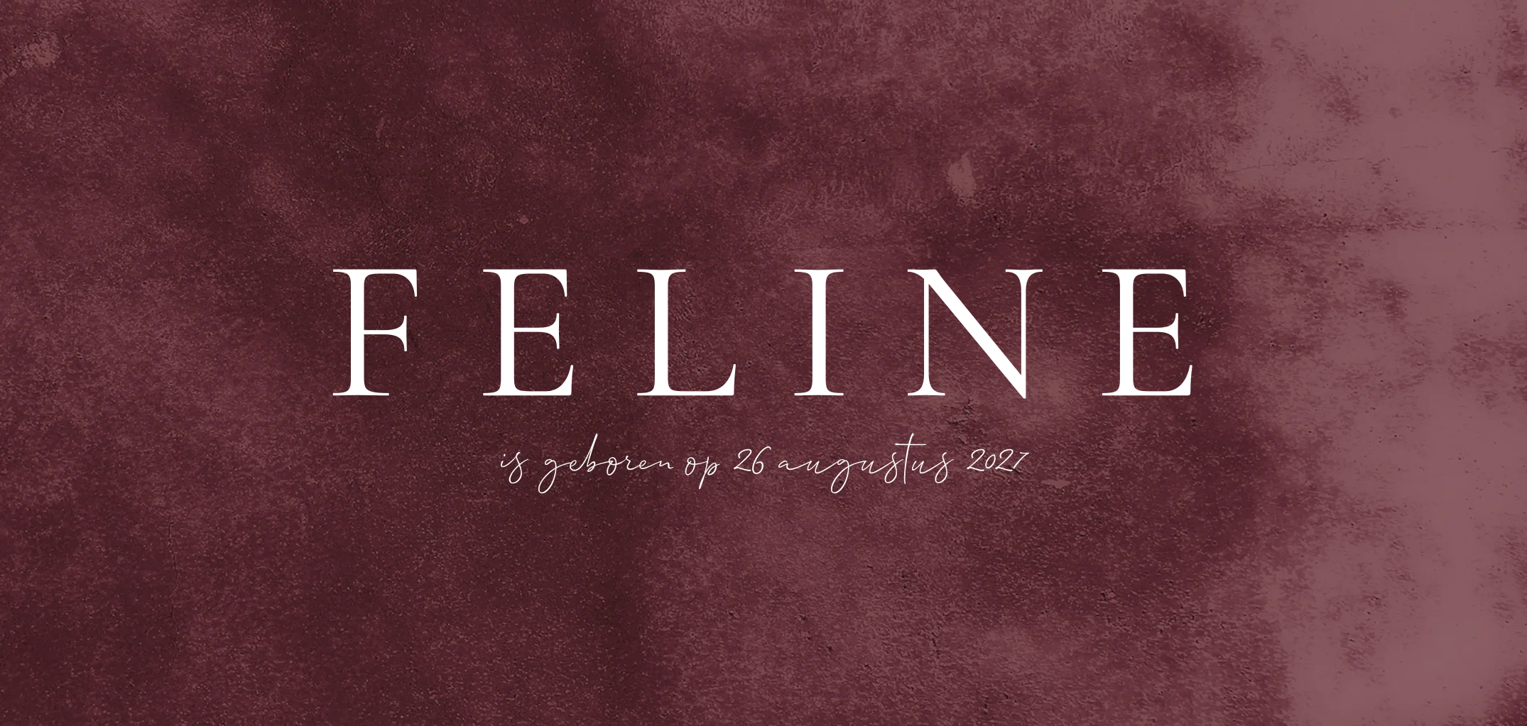 Een chic geboortekaartje voor jouw pasgeboren dochtertje. De voorkant heeft een mooie bordeaux rode achtergrond met een duidelijke textuur, dit geeft diepte aan dit verder eenvoudige kaartje. De koperen naam in klassieke letters maakt dit geboortekaartje tot een trendy ontwerp. Op de achterzijde komt de bordeaux rode textuur terug en kun je onder de geboorte-icoontjes de gegevens van je dochtertje plaatsen. Liever andere kleuren? Pas dit zelf aan in onze ontwerptool.