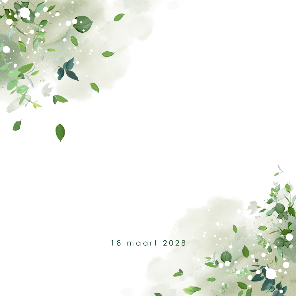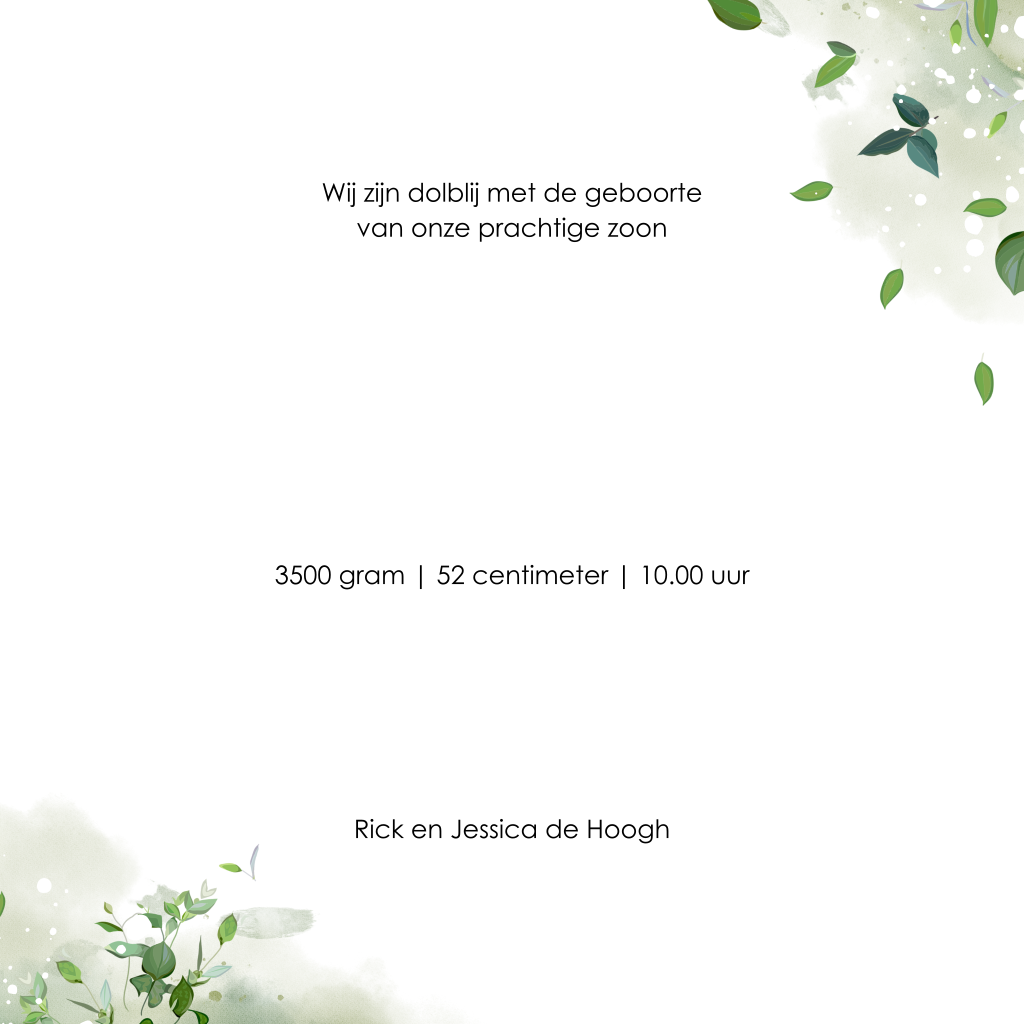 Ben je op zoek naar een botanisch geboortekaartje voor je aanstaande zoontje? Ga dan voor dit klassieke ontwerp met goudfolie initiaal, groene waterverf en getekende blaadjes. Ga je liever voor koper- of zilverfolie? Pas eenvoudig de foliekleur aan met behulp van onze ontwerptool.