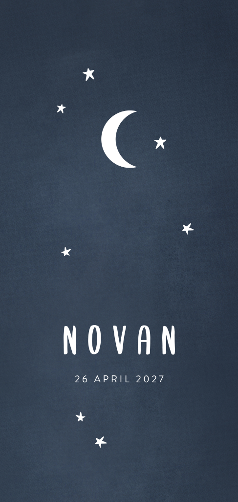 Geboortekaartjes met maantjes en sterren zijn helemaal van nu. Daarom hebben we dit hippe, donkerblauwe geboortekaartje met maan en sterren toegevoegd. De goudfolie op de naam en de illustraties maken het kaartje nog specialer. Je kunt eventueel ook voor koperfolie of zilverfolie kiezen. Op de achterzijde kun je de volledige naam en de geboortegegevens kwijt.