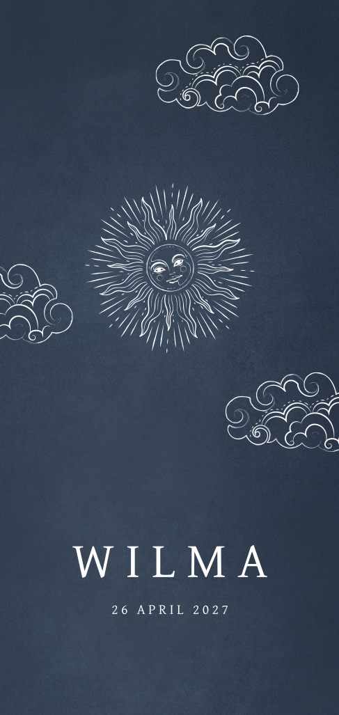 Is er een nieuw zonnetje in jouw leven? Vier haar komst met het versturen van dit prachtige geboortekaartje met donkerblauwe achtergrond, een goudfolie zon en witte getekende wolkjes. De foliedruk zorgt voor een opvallend en uniek geboortekaartje met een chique afwerking. Op de achterzijde van dit enkele kaartje komen de illustraties van de zon en wolken heel licht terug op de achtergrond. Plaats een mooie quote of gedichtje om dit geboortekaartje persoonlijker te maken.