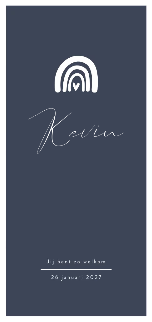 Donkerblauw geboortekaartje met regenboog en gouden hartje. Op zoek naar een hip geboortekaartje voor een jongen? Dan is dit ontwerp met donkerblauwe achtergrond en wit kader wat voor jou. Op de voorzijde van dit lieve kaartje staat een wit regenboogje met een in goudfolie gedrukt hartje en naam. Dit geeft de kaart zijn hippe uitstraling. Met een sierlijk, speels lettertype staat de naam van je zoontje voorop de kaart.