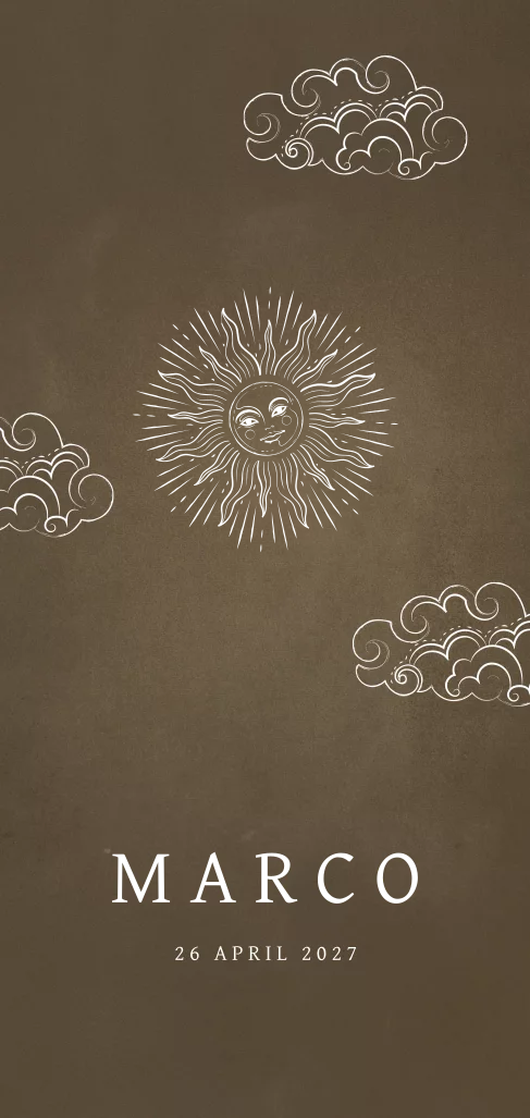 Met dit mooie geboortekaartje kondig je de geboorte van het nieuwe zonnetje in jouw leven op een feestelijke en stijlvolle manier aan. De goudfolie zon en naam zorgen voor een chique afwerking van dit donkerbruine kaartje. Op de achterkant glimlacht het zonnetje je ook lief toe en is er ruimte voor een mooie quote. Een trendy ontwerp dat zeker weten opvalt door de bijzondere illustraties en foliedruk.