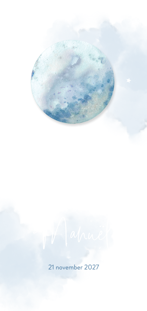 Stijlvol geboortekaartje om de komst van je kindje aan te kondigen op een bijzondere manier. De blauwe maan en waterverf vlekken zorgen voor een dromerig sfeertje en de naam in zilverfolie springt van het papier af. Ook de sterretjes zijn met folie gedrukt. Op de blauwe achterkant van dit kaartje komen de illustraties terug en kun je alle gegevens over de geboorte van je zoontje plaatsen.