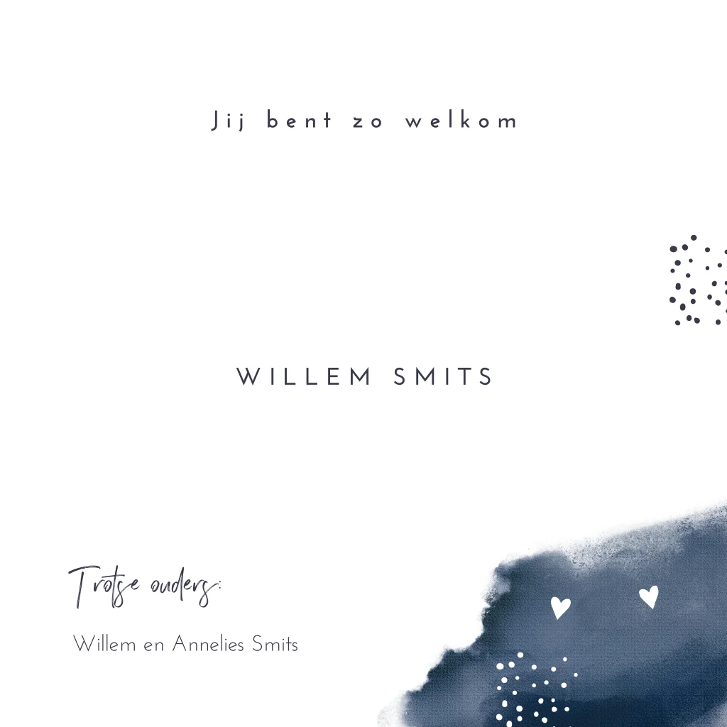 Jongens geboortekaartje met blauwe waterverf en zilveren hartjes. De trend van het moment... folie! Geef dit hippe geboortekaartje een chique uitstraling door de naam en hartjes op de voorkant in zilverfolie te bestellen. Samen met de donkerblauwe waterverf en speelse stipjes vormen alle elementen een mooi geheel. De tekst is gemakkelijk zelf aan te passen in onze designtool.