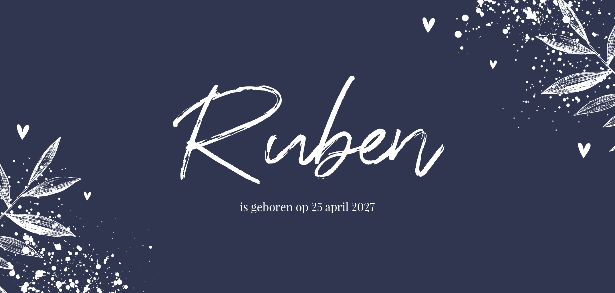 Chique geboortekaartje met hippe uitstraling. De voorzijde is donkerblauw met bladeren en gouden spetters. Met grote, speelse typografie staat de naam van je pasgeboren zoontje in het midden. Op de achterzijde is ruimte voor alle overige informatie. Maak de kaart op in de tool en bestel een drukproef van dit donkerblauwe geboortekaartje met gouden spetters en blaadjes.