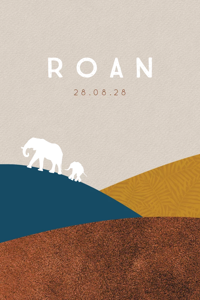 Abstract geboortekaartje met heuvels in bruin, okergeel en blauw. Er lopen twee olifantjes gedrukt in goudfolie en de naam staat in een stoer lettertype. Een hip ontwerp voor jouw pasgeboren zoontje! Ontwerp zelf dit kaartje in onze handige editor.