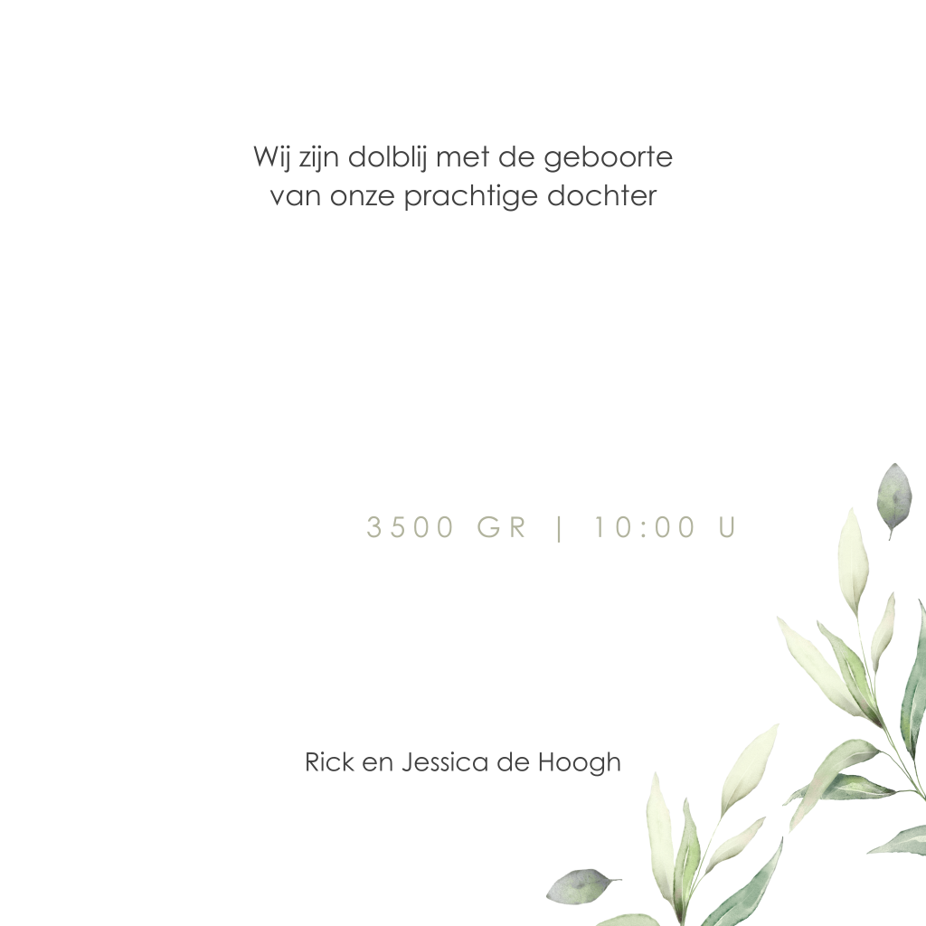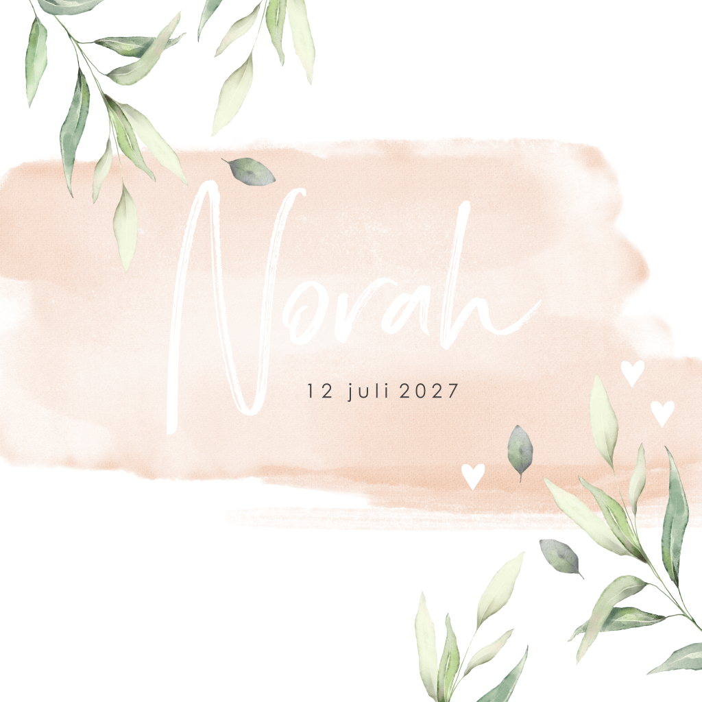 Goudfolie geboortekaartje met roze waterverf en groene blaadjes. Botanisch geboortekaartje met mooie roze waterverf in de populaire kleur 'blush'. De subtiele bladeren geven de kaart een stijlvolle uitstraling. Op de voorkant wordt de naam in een sierlijk en modern font met goudfolie gedrukt, hierdoor wordt het kaartje net even iets specialer. Benieuwd naar dit ontwerp, bestel een gepersonaliseerde drukproef.