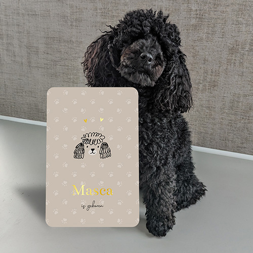 Hoe leuk is dit geboortekaartje met een schattige poedel? De meeste weten dat wij fan zijn van poedeltjes en dat Renate's eigen poedel, Masca, een speciaal plekje heeft in ons hart. Dus nu krijgt hij eindelijk zijn eigen moment in de spotlights, net alle andere lieve hondjes! Pas de kaart naar wens aan.