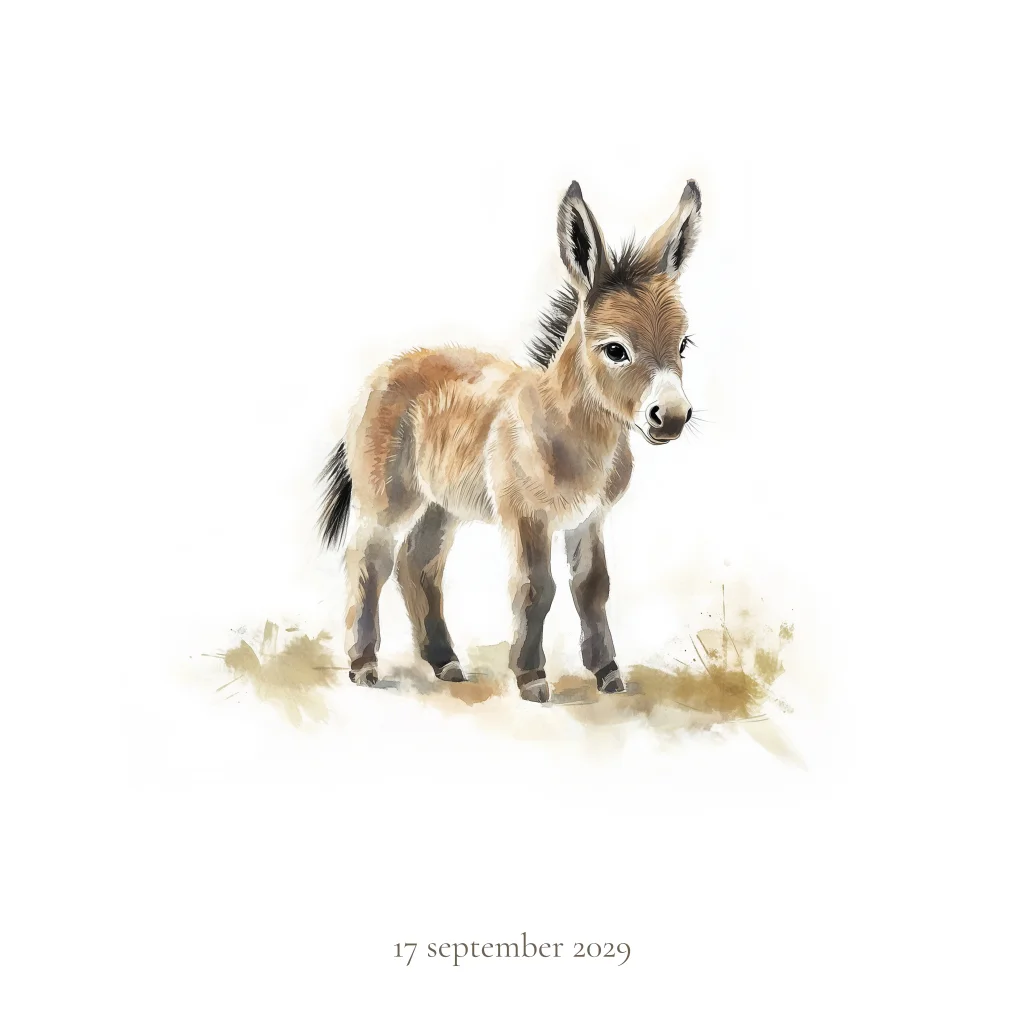 Kondig de geboorte van jullie kindje aan met dit schattige geboortekaartje ezel. Het lieve ezeltje is geïllustreerd in zachte aquarelkleuren. De goudfolie hartjes en naam geven het ontwerp een sprankelende uitstraling. Dit geboortekaartje met ezeltje kunnen jullie eenvoudig personaliseren met eigen teksten, lettertypes en kleuren in onze online editor. Bestel een proefdruk en ervaar hoe bijzonder dit kaartje in het echt is.