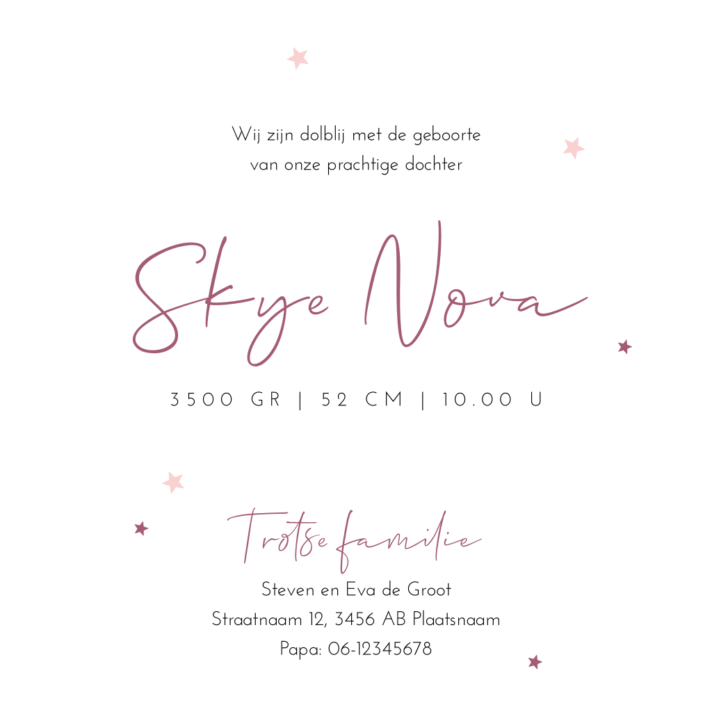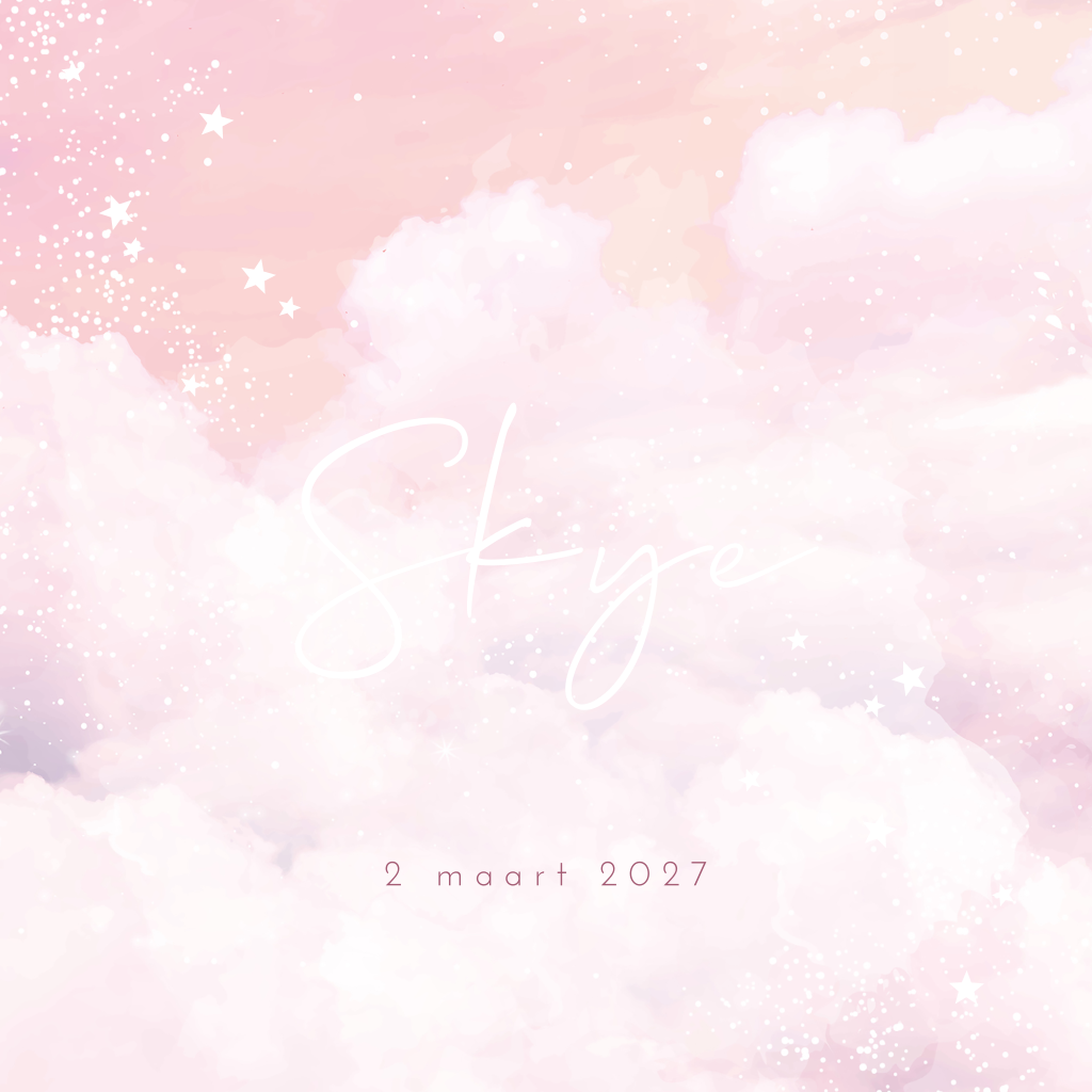 Dit vierkante geboortekaartje heeft een lieve, dromerige en zoete uitstraling door de roze wolken, gouden sterretjes en het sierlijke lettertype. De naam van je pasgeboren meisje wordt omringd door kleine gouden sterretjes. Plaats een mooi gedichtje dat goed bij jou en je kindje past aan de binnenzijde van de kaart. Zo maak je dit kaartje nog net iets persoonlijker. De wolkenlucht en sterren komen ook aan de binnenzijde terug.