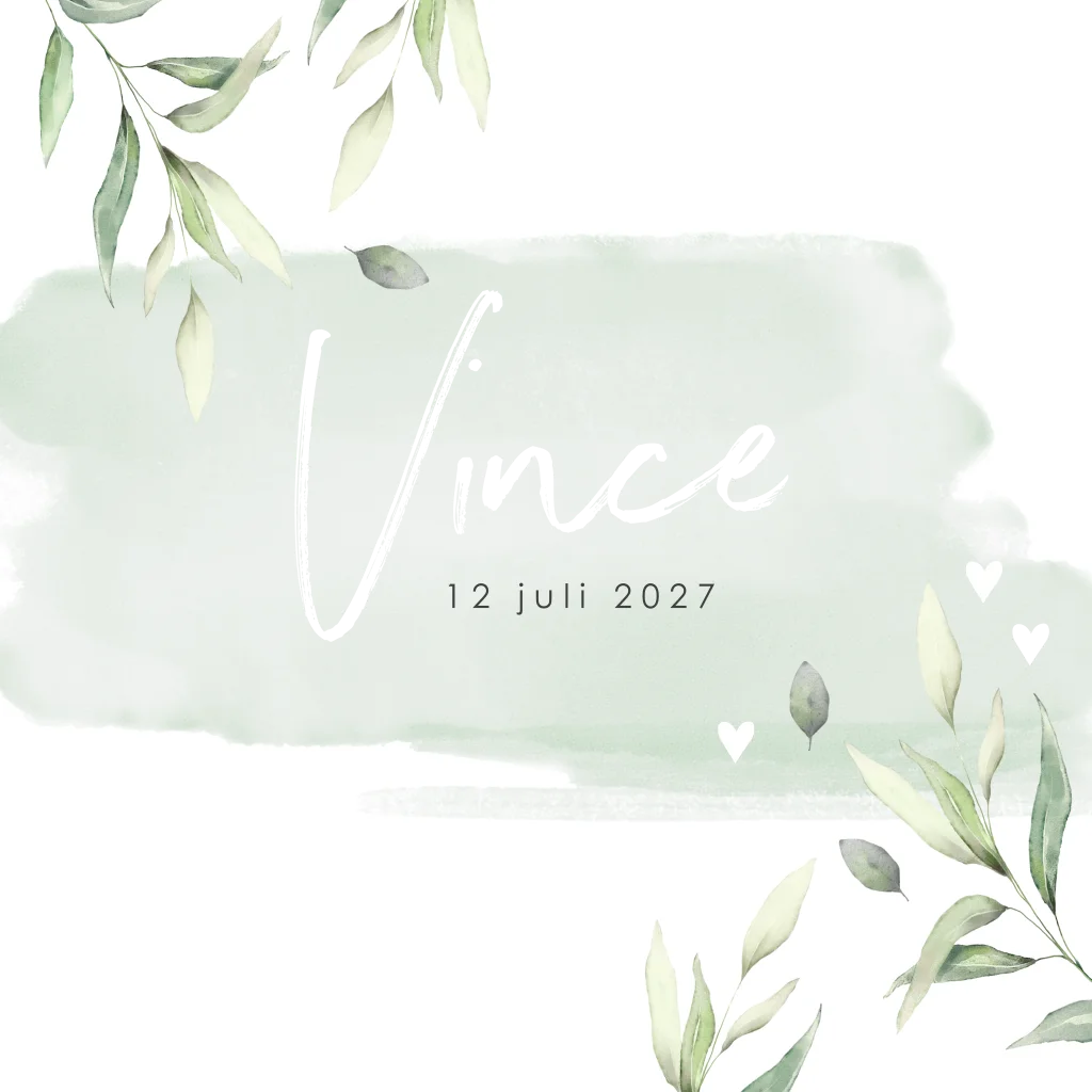 Goudfolie geboortekaartje jongen met groene waterverf en blaadjes